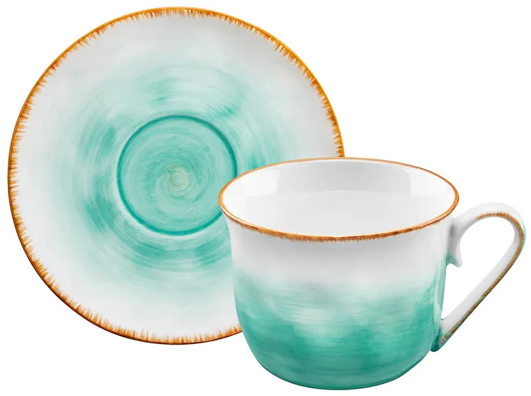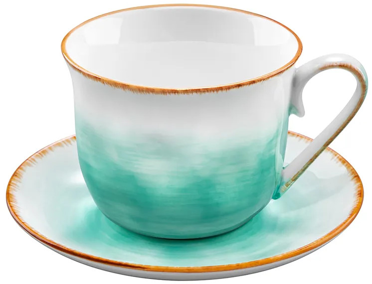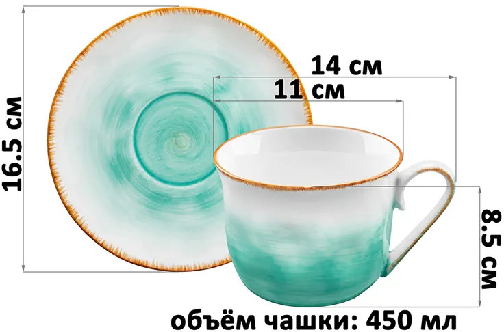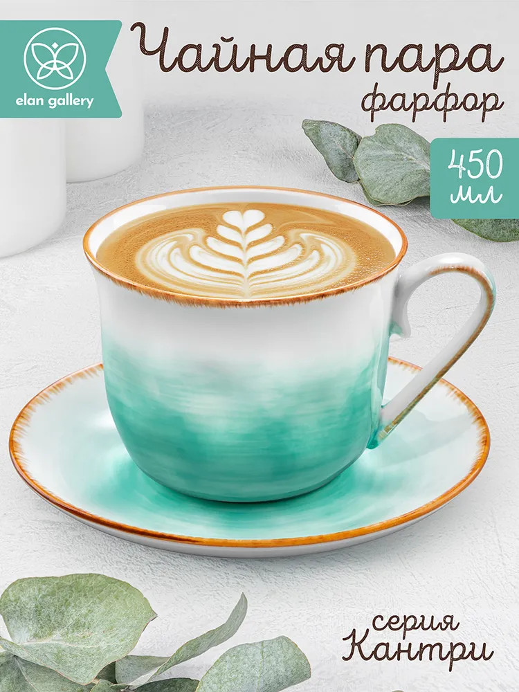 Чайная пара из серии «Кантри» от Elan Gallery предназначена для эстетичной сервировки вашего стола. Размер ёмкости — 14×11×8.5 см, объём — 450 мл. Размер блюдца — 16.5×16.5×2 см. Выполнены из высококачественного белого фарфора. Он не впитывает цвет продуктов и напитков и легко отмывается, благодаря чему надолго сохранит свою белизну. Изделия имеют необычную геометрию и украшены насыщенным бирюзовым оттенком. Окантовка имитирует натуральный древесный узор.