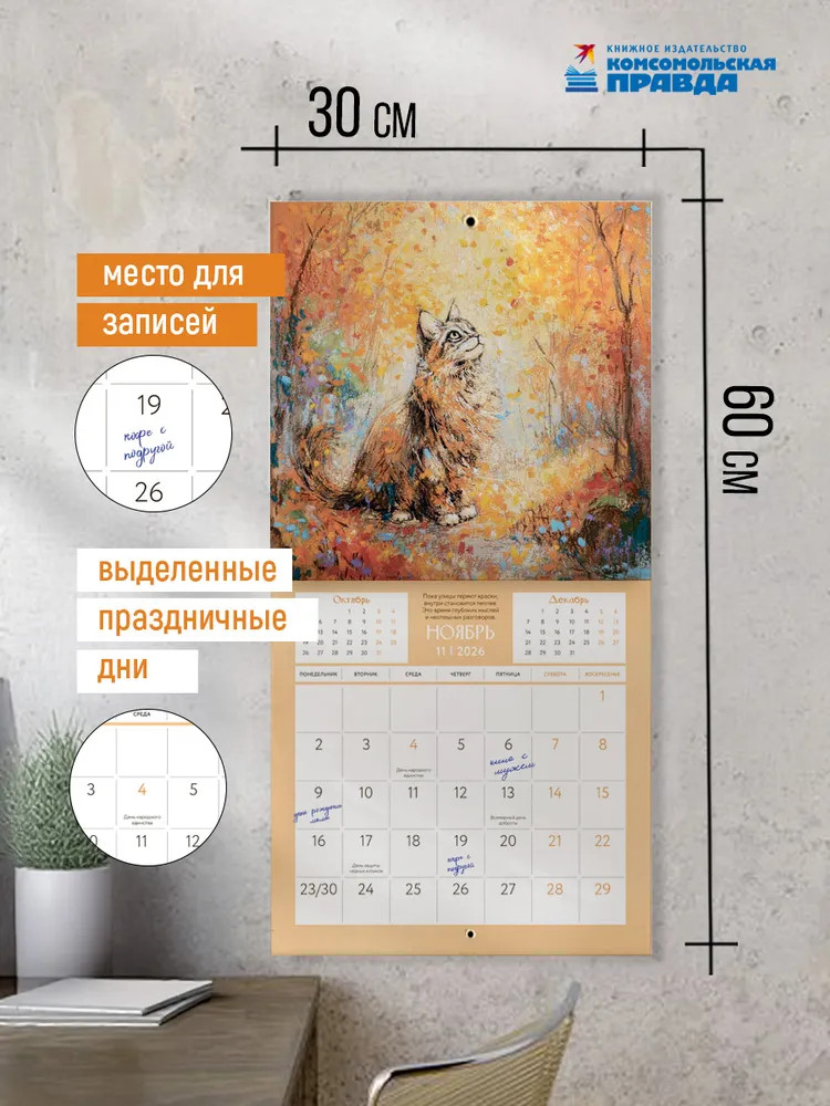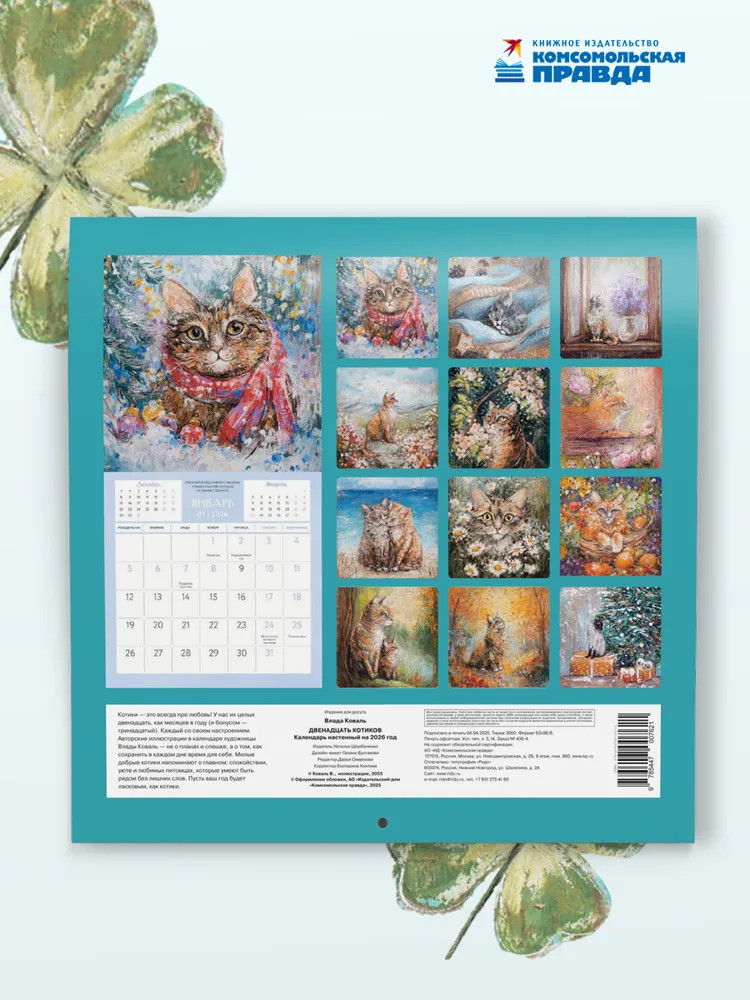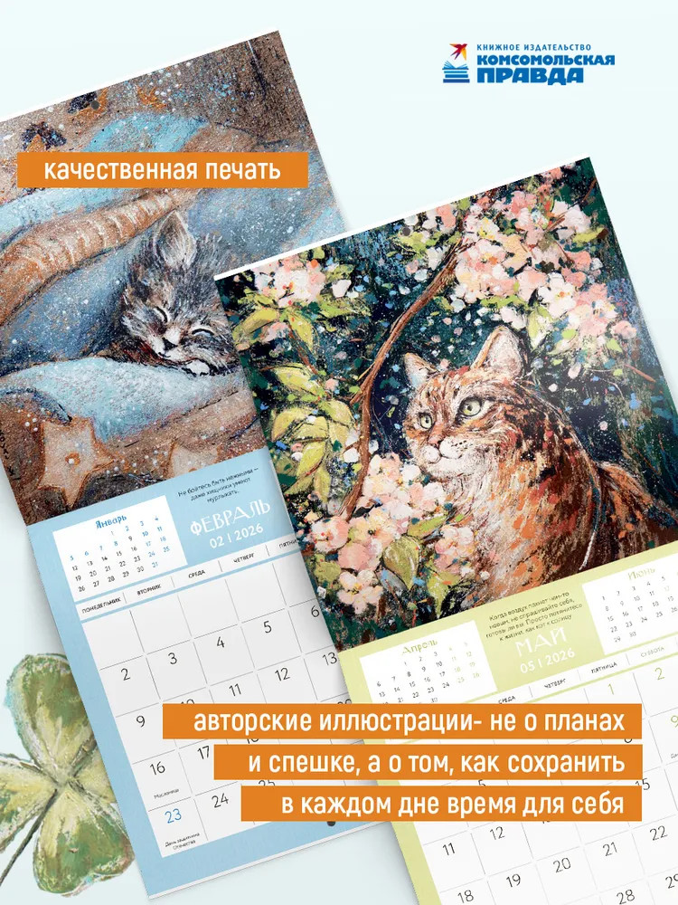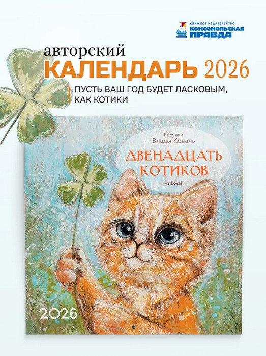 Котики — это всегда про любовь! У нас их целых двенадцать, как месяцев в году (и бонусом — тринадцатый). Каждый со своим настроением. Авторские иллюстрации в календаре художницы Влады Коваль — не о планах и спешке, а о том, как сохранить в каждом дне время для себя. Милые добрые котики напоминают о главном: спокойствии, уюте и любимых питомцах, которые умеют быть рядом без лишних слов. Пусть ваш год будет ласковым, как котики. |
