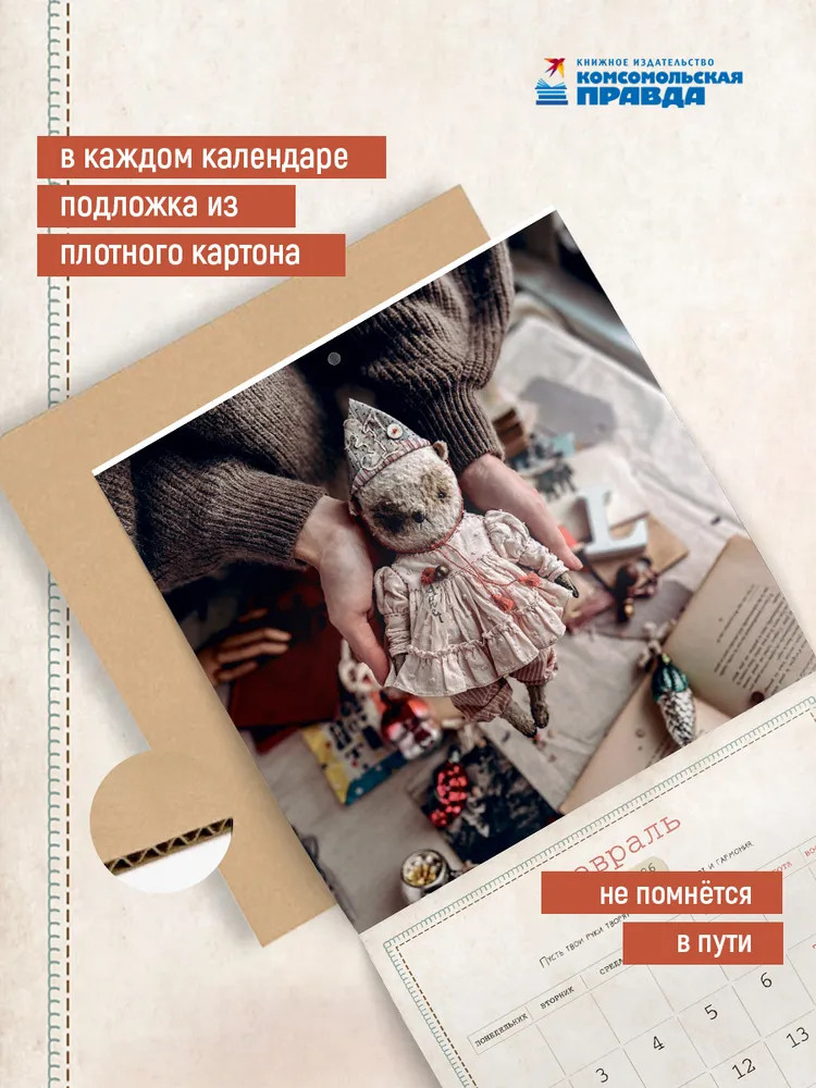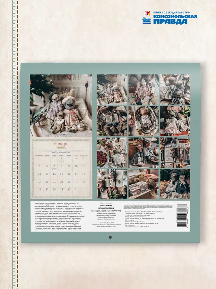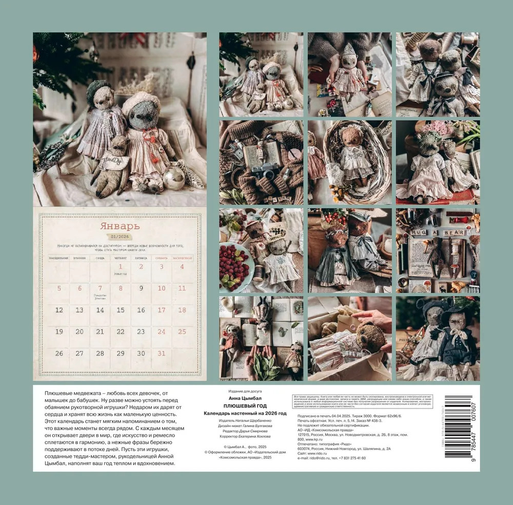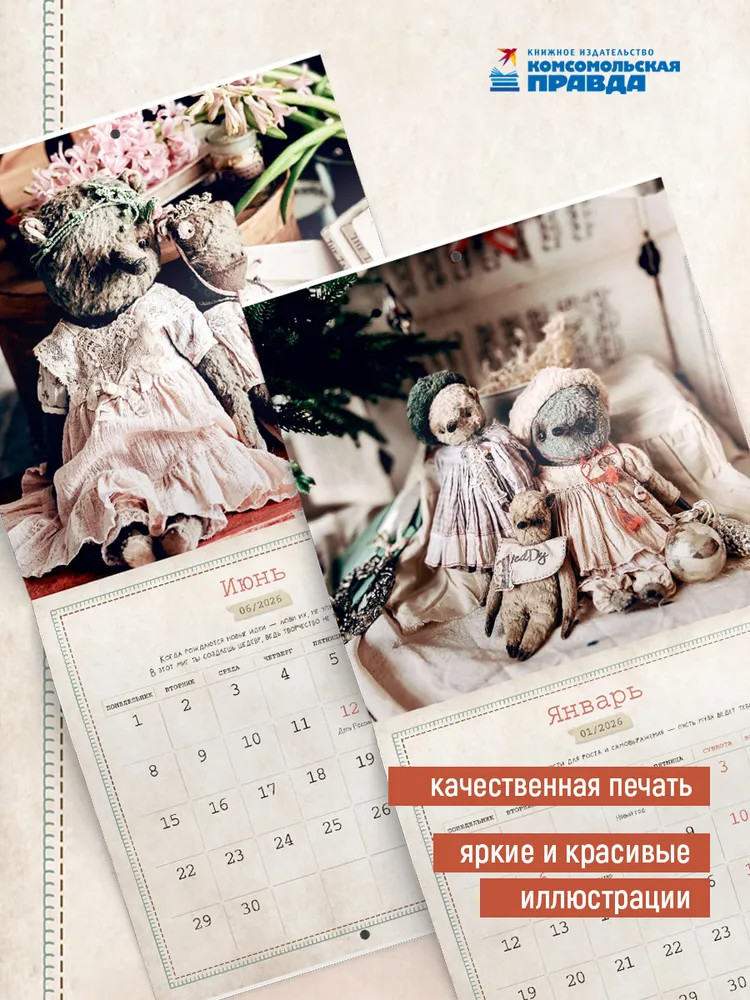 Плюшевые медвежата — любовь всех девочек, от малышек до бабушек. Ну разве можно устоять перед обаянием рукотворной игрушки? Недаром их дарят от сердца и хранят всю жизнь как маленькую ценность. Этот календарь станет мягким напоминанием о том, что важные моменты всегда рядом. С каждым месяцем он открывает двери в мир, где искусство и ремесло сплетаются в гармонию, а нежные фразы бережно поддерживают в потоке дней. Пусть эти игрушки, созданные тедди — мастером, рукодельницей Анной Цымбал, наполнят ваш год теплом и вдохновением. |