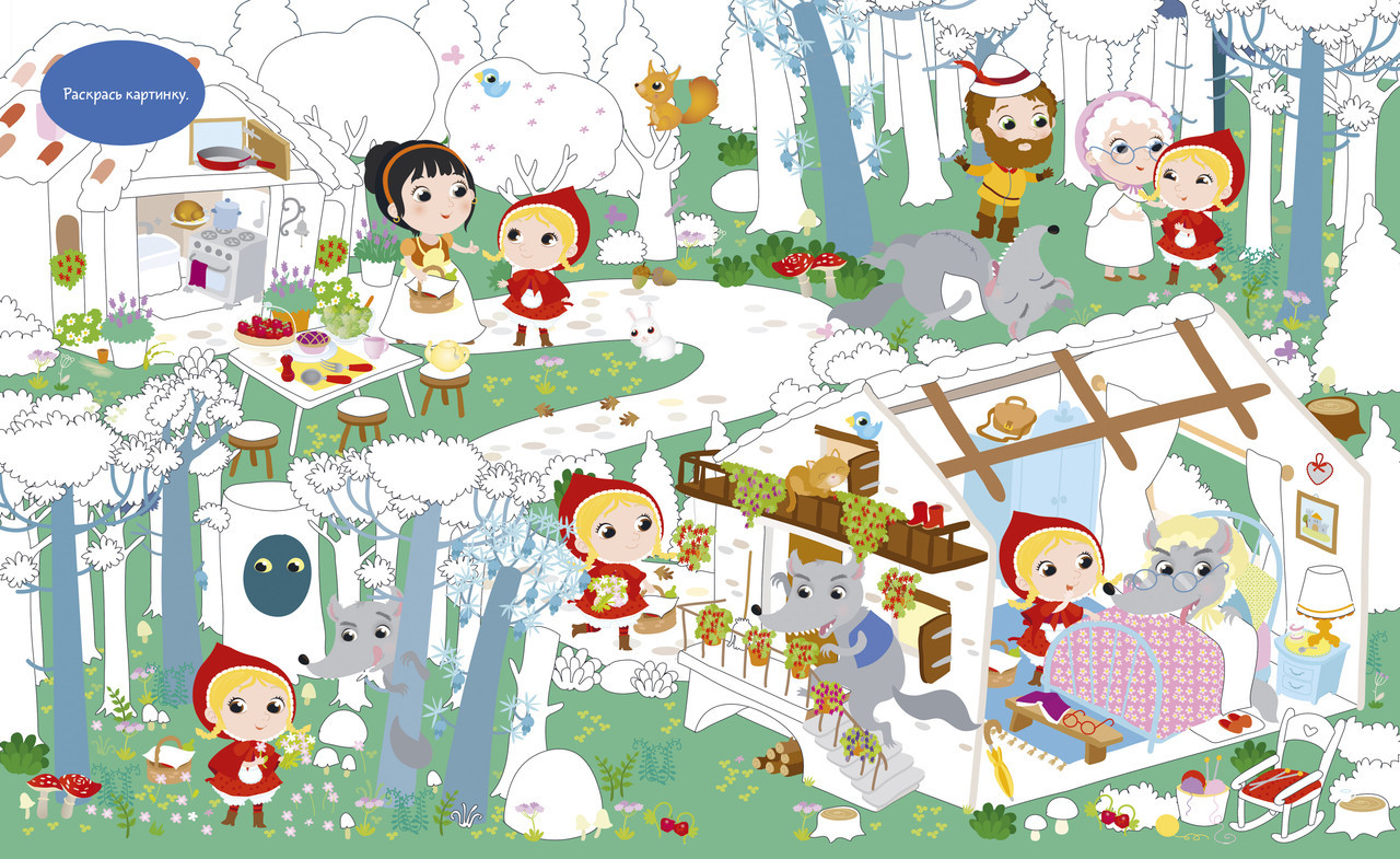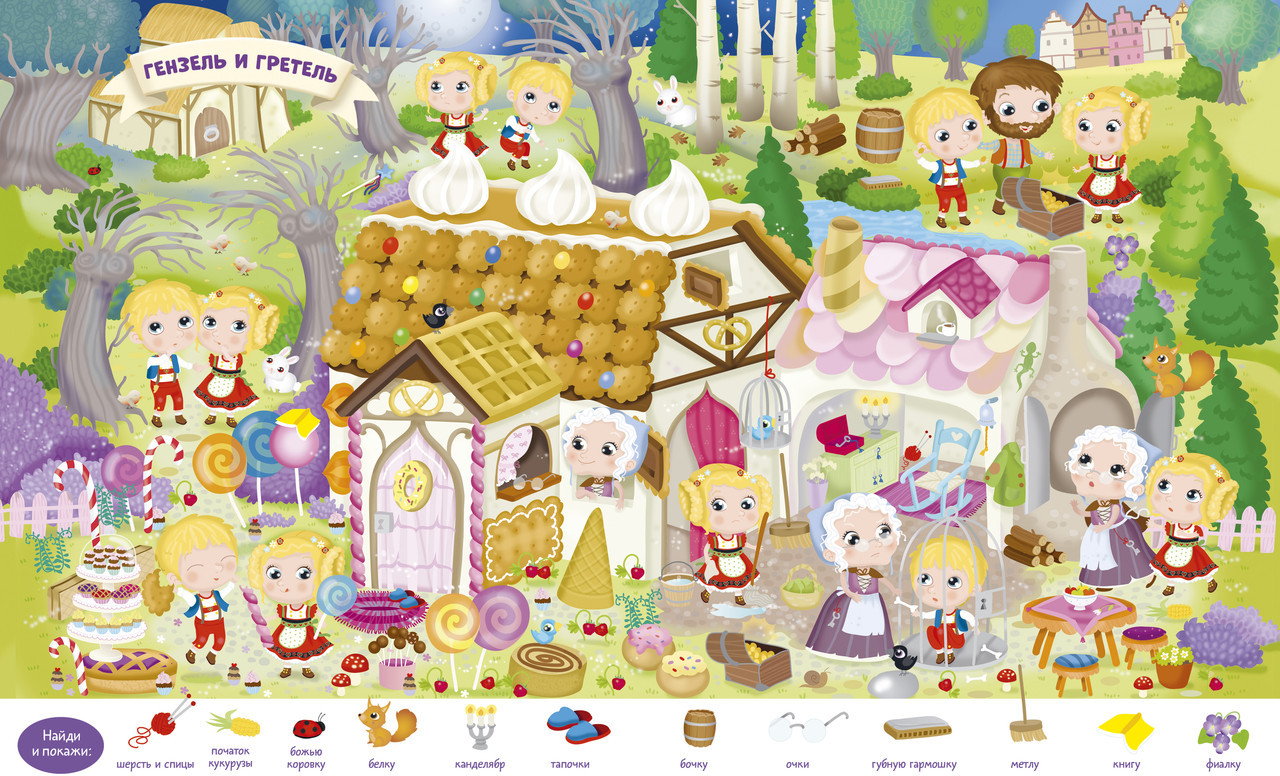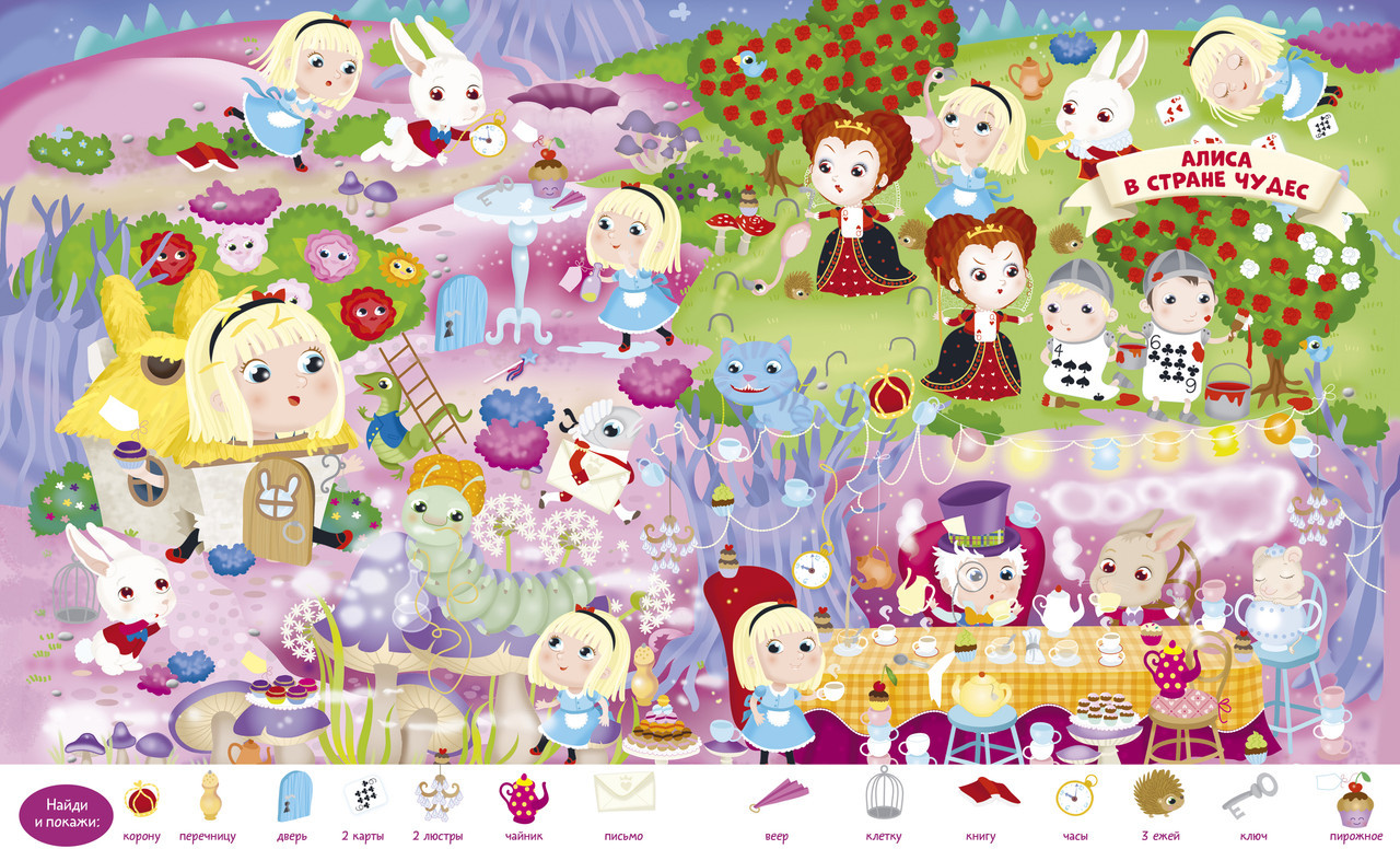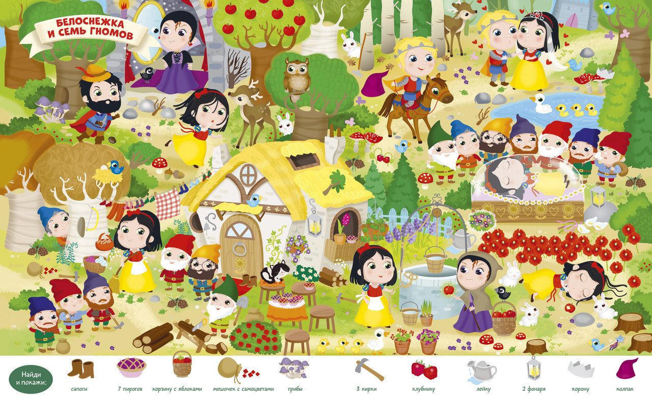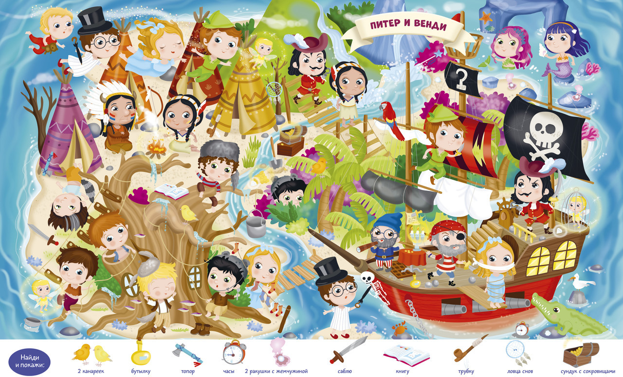 Серия: Найди и покажи На страницах этой книжки активити живут герои самых разных сказок: Аладдин и Пиноккио, три поросенка, Гензель и Гретель, Белоснежка и многие другие. Тут можно искать спрятанные предметы, раскрашивать картинки и дополнять их яркими стикерами. В книге ждут девять сюжетных разворотов для игры в «найди и покажи», три большие раскраски и панорамная иллюстрация для аппликации из наклеек. Ваш ребенок побывает на чаепитии в Стране чудес, на корабле капитана Крюка, на балу вместе с Золушкой и в лесу с Красной Шапочкой, а попутно отыщет все спрятанные предметы, раскрасит сказочные сценки и дополнит наклейками подводное царство Русалочки. Книга выходит в удобной мягкой обложке — берите книгу с собой, чтобы занять ребенка игрой, где бы вы ни были: в гостях, долгой очереди, в дороге или в путешествии. |