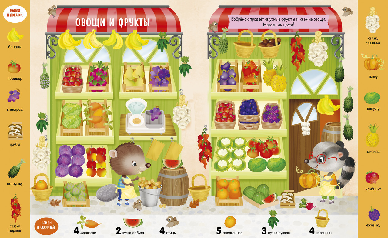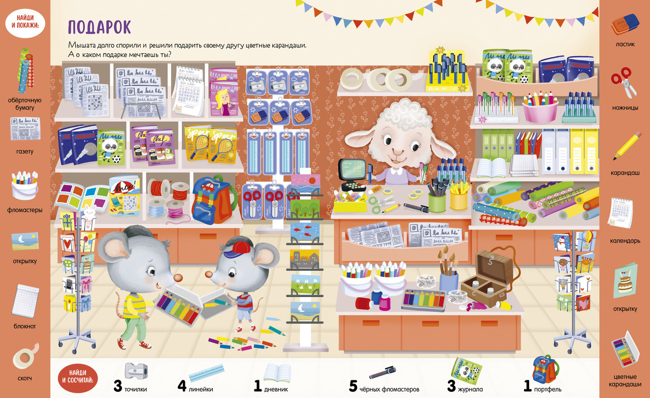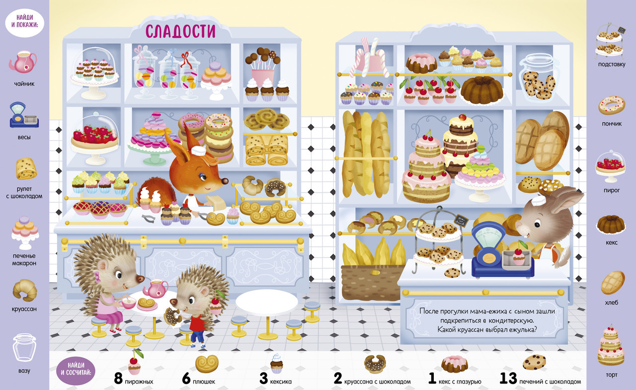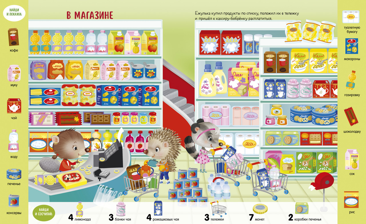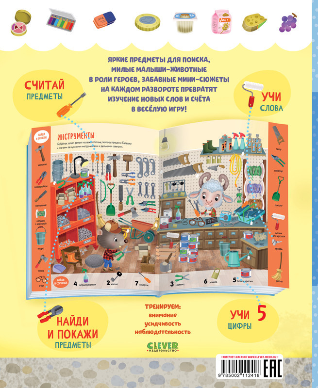 Серия: Найди и покажи Книга «Учусь считать от 1 до 15. Найди, покажи, сосчитай» с яркими предметами для поиска и милыми малышами-животными превратит изучение новых слов и счета в веселую игру. Разглядывайте вместе с ребенком забавные сценки на каждом развороте и выполняйте задания на полях: найти красную машинку и сосчитать плюшевых медвежат в магазине игрушек, отыскать розовый пончик и восемь пирожных в кондитерской. Играйте и тренируйте внимательность, усидчивость и наблюдательность малыша. С книгой ребенок без труда освоит первый счет: переходите из одного сюжета в другой, найдите и сосчитайте все спрятанные предметы! |