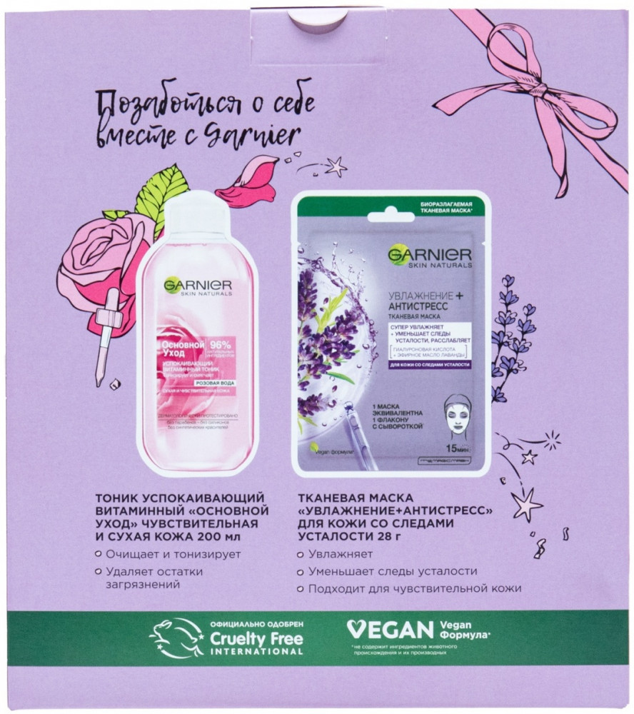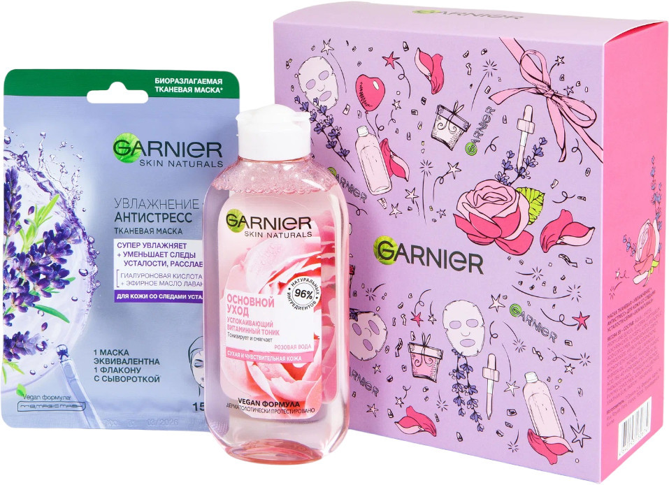 Набор для ухода Garnier «Роза + Лаванда» — идеальное сочетание для чувствительной и сухой кожи, которое обеспечивает мягкое очищение, глубокое увлажнение и ощущение свежести. Тоник с экстрактом розы бережно тонизирует и освежает кожу, придавая ей естественное сияние, а тканевая маска с экстрактом лаванды успокаивает и наполняет влагой, возвращая ощущение комфорта и мягкости. Такой дуэт идеально подойдёт для вечернего ухода — поможет снять усталость, восстановить баланс кожи и подарит приятное чувство расслабления. Стильный и практичный набор станет отличным подарком для тех, кто ценит натуральный уход и заботу о себе. |