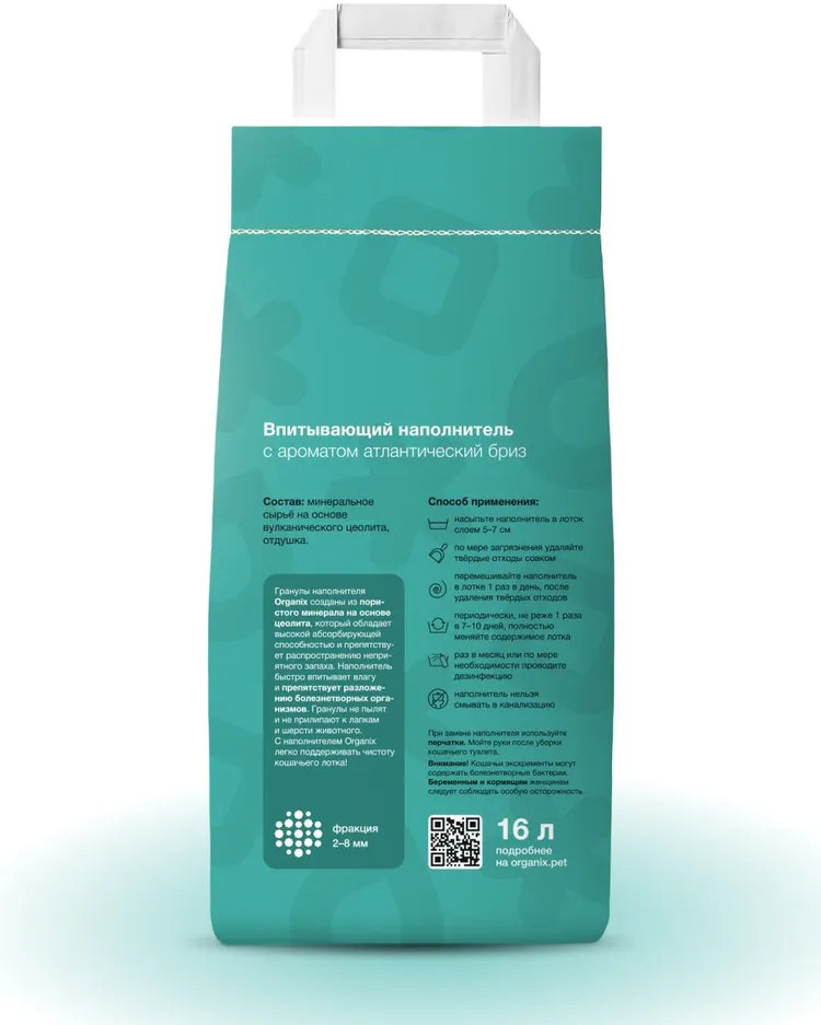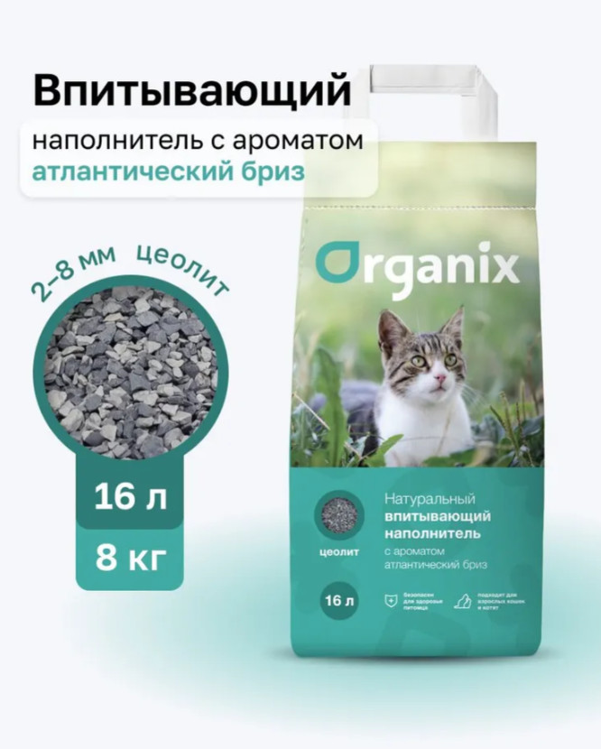 Гранулы наполнителя Organix созданы из пористого минерала на основе цеолита, который обладает высокой абсорбирующей способностью и препятствует распространению неприятного запаха. Фракция: 2-8 мм. Наполнитель быстро впитывает влагу и препятствует разложению болезнетворных организмов. Гранулы не пылят и не прилипают к лапкам и шерсти животного. При намокании раскрывается приятный аромат атлантического бриза. С наполнителем Organix легко поддерживать чистоту кошачьего лотка!