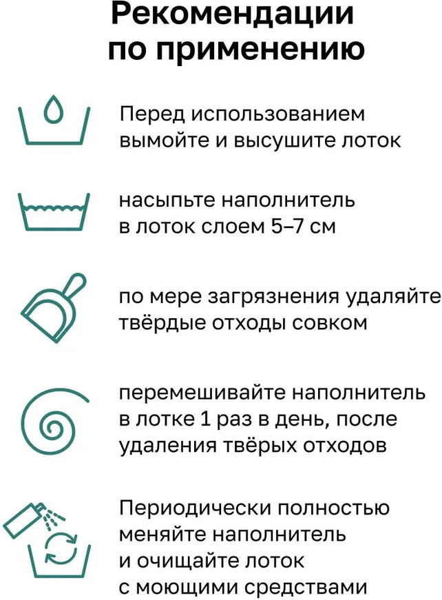 Способ применения: перед использованием вымойте и высушите лоток. Насыпьте наполнитель в лоток слоем 5-7 см. По мере загрязнение удаляйте твердые отходы совком. Перемешивайте наполнитель в лотке 1 раз в день. Периодически полностью меняйте наполнитель и очищайте лоток с моющими средствами. Добавляйте наполнитель по мере необходимости.