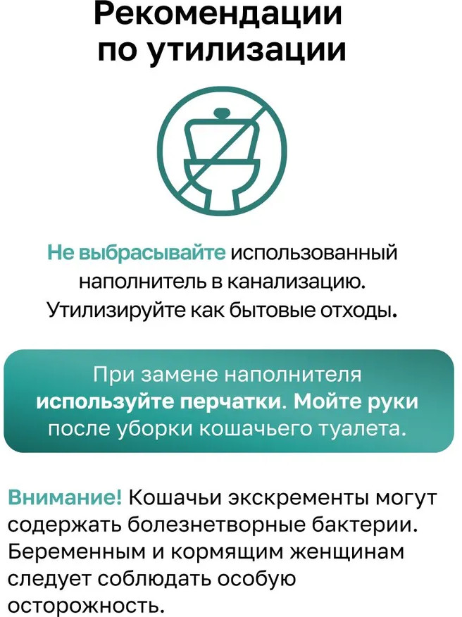 Меры предосторожности: не выбрасывайте использованный наполнитель канализацию. Утилизируйте как бытовые отходы. При замене наполнителя используйте перчатки. Мойте руки после уборки кошачьего туалета. Храните наполнитель в недоступном для детей и животных месте. Кошачьи экскременты могут содержать болезнетворные бактерии. Беременным и кормящим женщинам следует соблюдать особую осторожность.