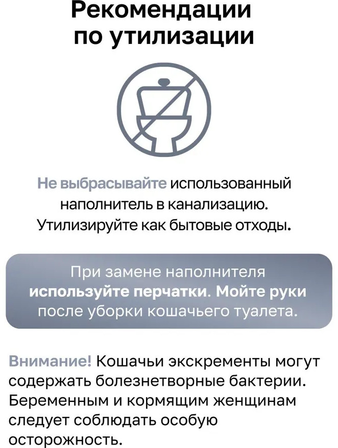 Меры предосторожности: не выбрасывайте использованный наполнитель канализацию. Утилизируйте как бытовые отходы. При замене наполнителя используйте перчатки. Мойте руки после уборки кошачьего туалета. Храните наполнитель в недоступном для детей и животных месте. Кошачьи экскременты могут содержать болезнетворные бактерии. Беременным и кормящим женщинам следует соблюдать особую осторожность.