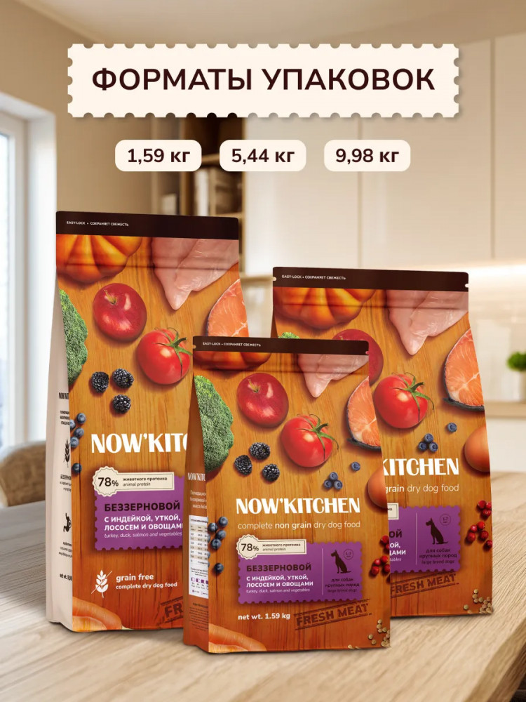 Now'Kitchen Корм беззерновой для взрослых собак крупных пород со свежей индейкой, уткой, лососем «Turkey, Duck & Salmon»