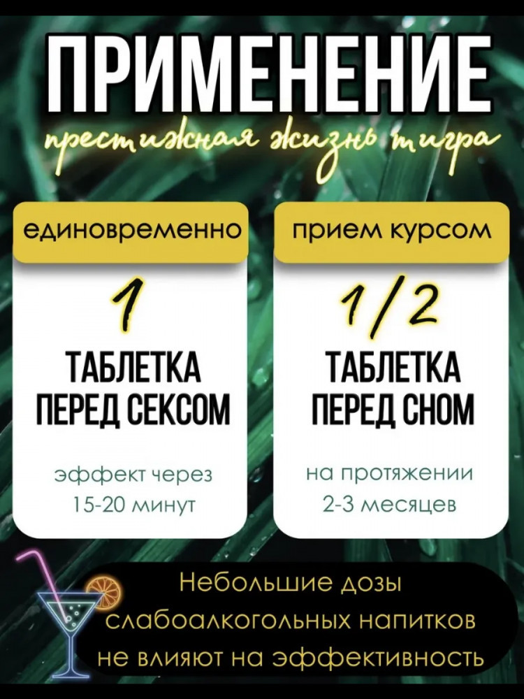 Способ применения: принимайте не более 1 таблетки в 24 часа за 10-20 минут перед половым актом. Эффект от приёма длится до 72 часов.