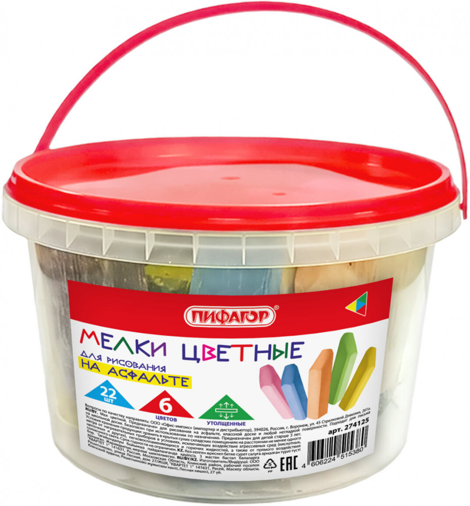 Цветной мел подходит для рисования на асфальте. Цветные мелки отлично подойдут для рисования и подвижных игр на улице! В наборе 22 ярких мелка шести различных цветов: голубой, зеленый, желтый, красный, оранжевый, белый. Благодаря квадратной утолщенной форме с заостренным концом мел удобно ложится в руку и рисует на асфальте. Изготовлен из высококачественного природного сырья без добавления гипса, нетоксичен. Легко смывается с рук. Мел упакован в пластиковое ведерко — идеально, чтобы хранить мел или брать его с собой.