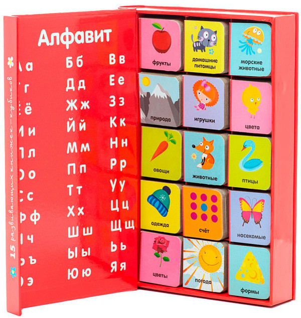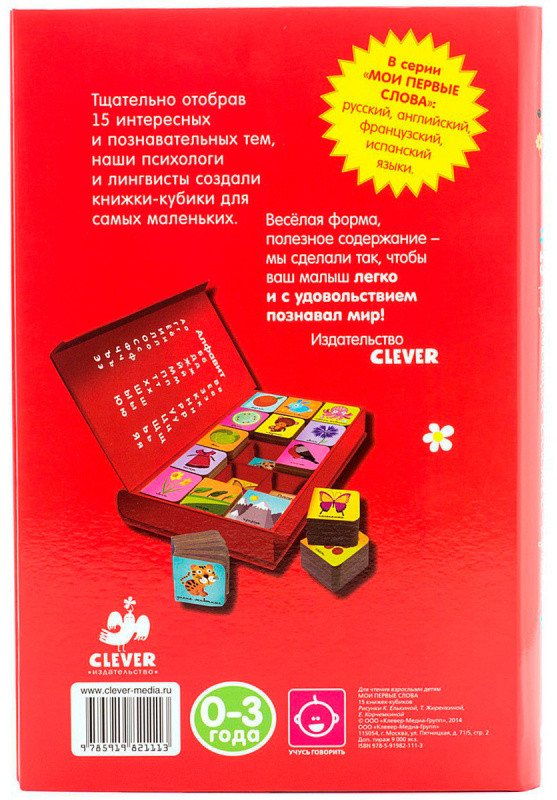 15 книжек-кубиков. Русский язык.новинка В данный момент этот товар отсутствует в продаже. Возможно, у нас найдется аналогичный или похожий товар здесь. Серия: Мои первые слова Книжки-кубики — уникальное пособие для развития мелкой моторики, знакомства с окружающим миром и начала изучения первых слов в раннем возрасте ребенка. Тщательно отобрав 15 интересных и познавательных тем, наши психологи и педагоги создали книжки-кубики для маленьких детей. Одежда, цвета, животные, фрукты и многое другое — все базовые темы для развития интеллекта малыша, теперь в одной коробке! Набор картонных книжек в форме кубиков созданы для развития речи, внимания, мелкой моторики, памяти и быстрого познания окружающего мира детьми. На внутренней стороне коробки есть алфавит русского языка. Ребенок учит буквы и слова, весело играя! |