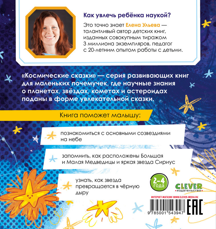 Серия: Космические сказки Книга «Космические сказки. Звёзды» познакомит вашего ребенка с основными созвездиями на небе и поможет запомнить, как расположены Большая и Малая Медведицы и яркая звезда Сириус. Ваш малыш также узнает, как звезда превращается в чёрную дыру. Серия «Космические сказки»- развивающие книги для маленьких почемучек, где научные знания о планетах, звездах, кометах и астероидах поданы в форме увлекательной сказки. |