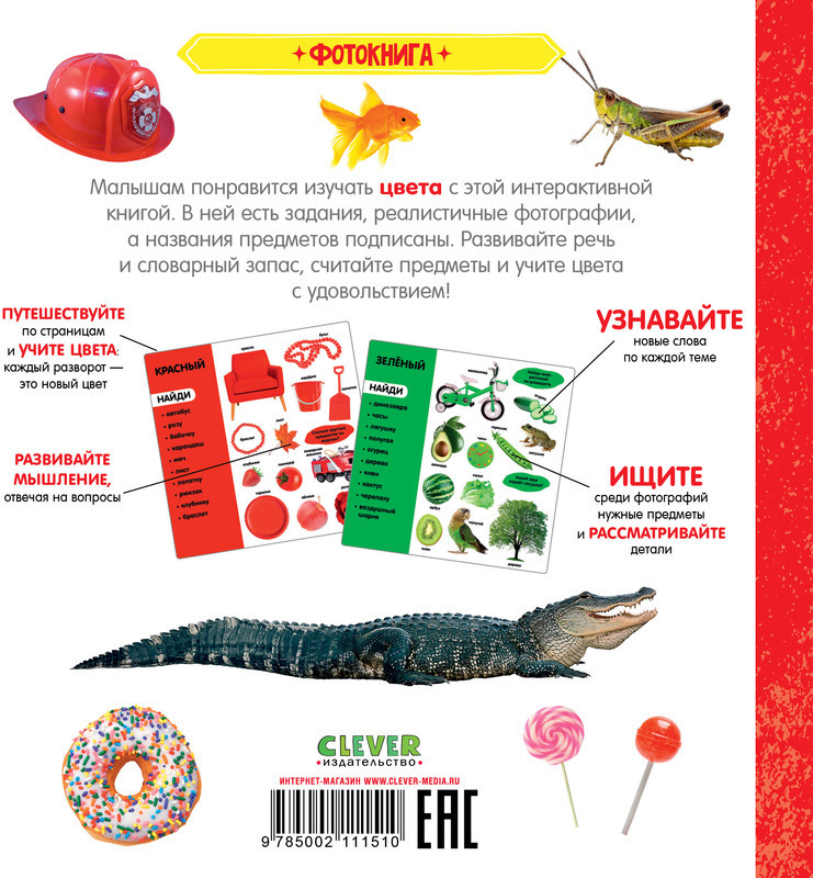 Серия: Первые знания. Фотокниги «Фотокнига. Цвета» — это интерактивный визуальный словарь, который сделает изучение цветов и новых слова проще и гораздо интереснее для вашего малыша. Путешествуйте по страницам и учите цвета: каждый разворот — это новый цвет. Узнавайте новые слова по каждой теме. Развивайте мышление, отвечая на вопросы. Ищите среди фотографий нужные предметы и рассматривайте детали. Развивайте речь и словарный запас, считайте предметы и учите цвета с удовольствием! С книгой ваш ребенок выучит более 240 слов, потренирует внимательность в игре «найди и покажи» и познакомится со всем разноцветным многообразием предметов, окружающих его каждый день. Играйте и изучайте мир с удовольствием! |