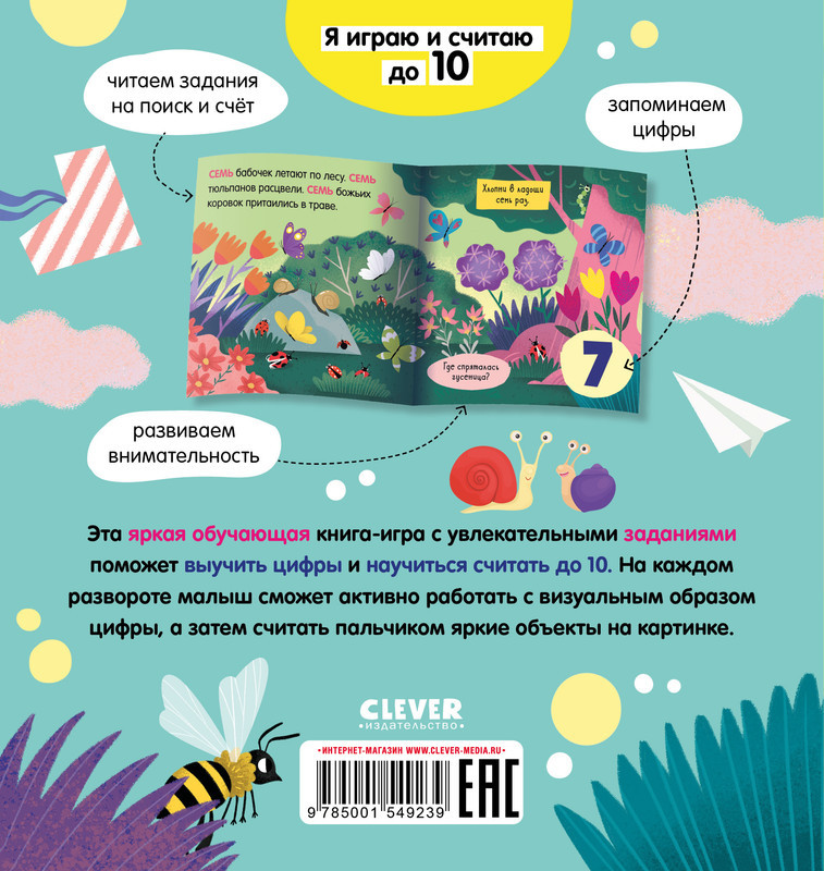 Серия: Найди и покажи, малыш «Цифры. Я играю и считаю до 10» — это обучающая книга-игра, которая поможет детям освоить первый счет. Малыш будет активно работать с визуальным образом цифры, а затем искать и считать предметы на страницах. На каждом развороте — свой небольшой сюжет и картинка, на которой нужно сосчитать указанные объекты и выполнить задание: пять раз подуть на облако или семь раз хлопнуть в ладоши. Ищите и считайте, играйте, запоминайте цифры и развивайте внимательность малыша вместе с этой книгой! |