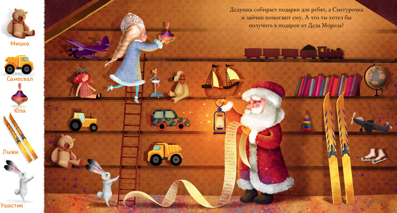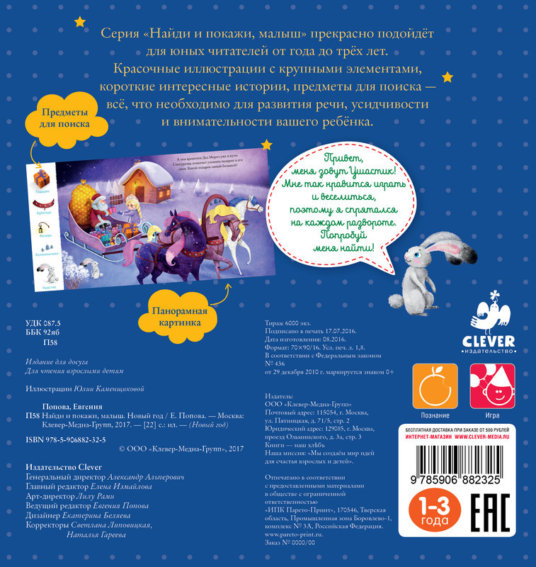 Серия: Найди и покажи, малыш Эта детская книжка из серии «Найди и покажи», поэтому на каждой страничке ребенку предлагается найти определенный набор предметов — они вынесены на край страницы. Кроме того, маленький симпатичный зайчик ведет малыша через всю книжку, и его тоже нужно искать на каждой страничке. Книга «Найди и покажи, малыш. Новый год» прекрасно подойдет для детей до 3 лет. Красочные иллюстрации с крупными элементами, короткие интересные истории, предметы для поиска — всё, что необходимо для развития речи, логики и внимательности вашего ребенка. |