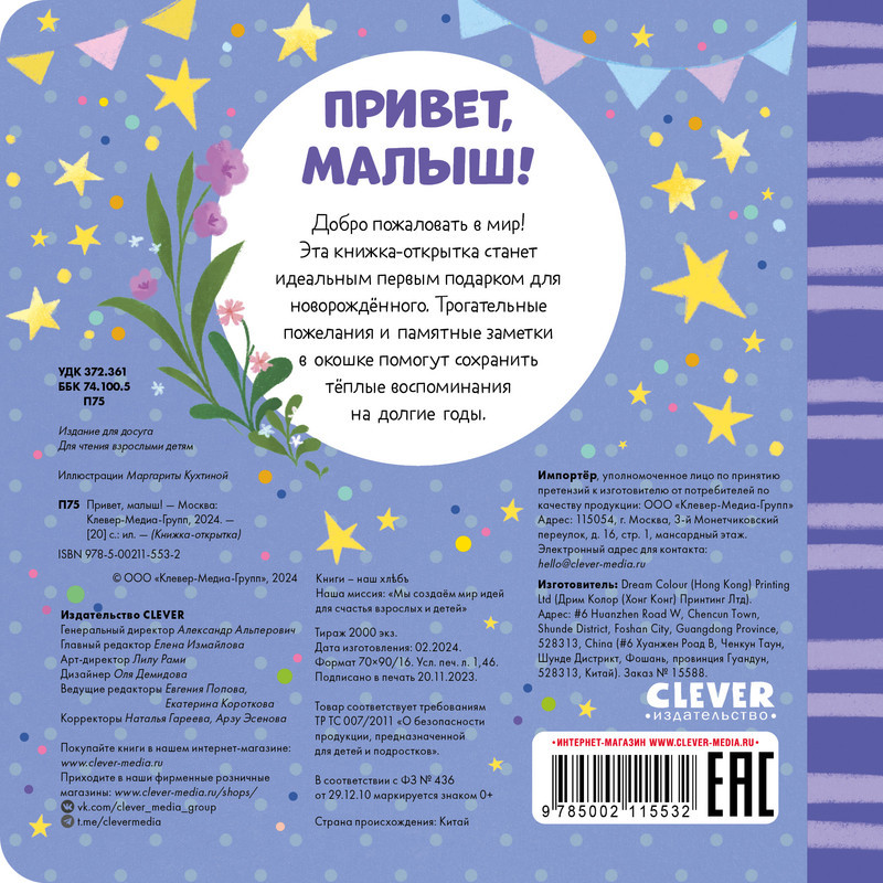 Привет, малыш!новинка В данный момент этот товар отсутствует в продаже. Возможно, у нас найдется аналогичный или похожий товар здесь. Серия: Книжка-открытка Подпишите окошко на обложке и сделайте уникальный подарок новорожденному мальчику! Трогательные пожелания на страницах и памятные заметки в окошке помогут сохранить теплые воспоминания на долгие годы. Книжка-открытка «Привет, малыш!» — это уникальный сувенир на память о самом радостном дне и идеальный способ сказать ребенку: «Добро пожаловать в мир!». На каждой странице ждут уютные иллюстрации и трогательные пожелания, к которым малышу будет приятно возвращаться год за годом. Читайте их вместе, как сказку, чтобы разделить друг с другом самые трепетные, нежные и значимые моменты. А ваши заметки в карточке на обложке сделают этот подарок по-настоящему личным. Книга создана для маленьких детских ручек: плотные картонные страницы не помнутся и не порвутся, а скругленные уголки не поранят пальчики. |