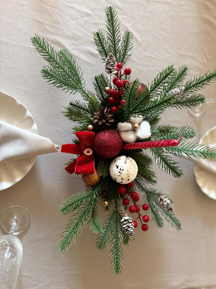 Создайте волшебную атмосферу праздника в доме! Элегантная новогодняя композиция ручной работы из качественной искусственной хвои украсит ваш праздничный стол, каминную полку или станет тёплым подарком для близких. Каждая деталь подобрана с любовью: натуральные шишки со снежным декором, яркие елочные шары, ягодные веточки и изящные банты — всё гармонично сочетается, создавая праздничное настроение.