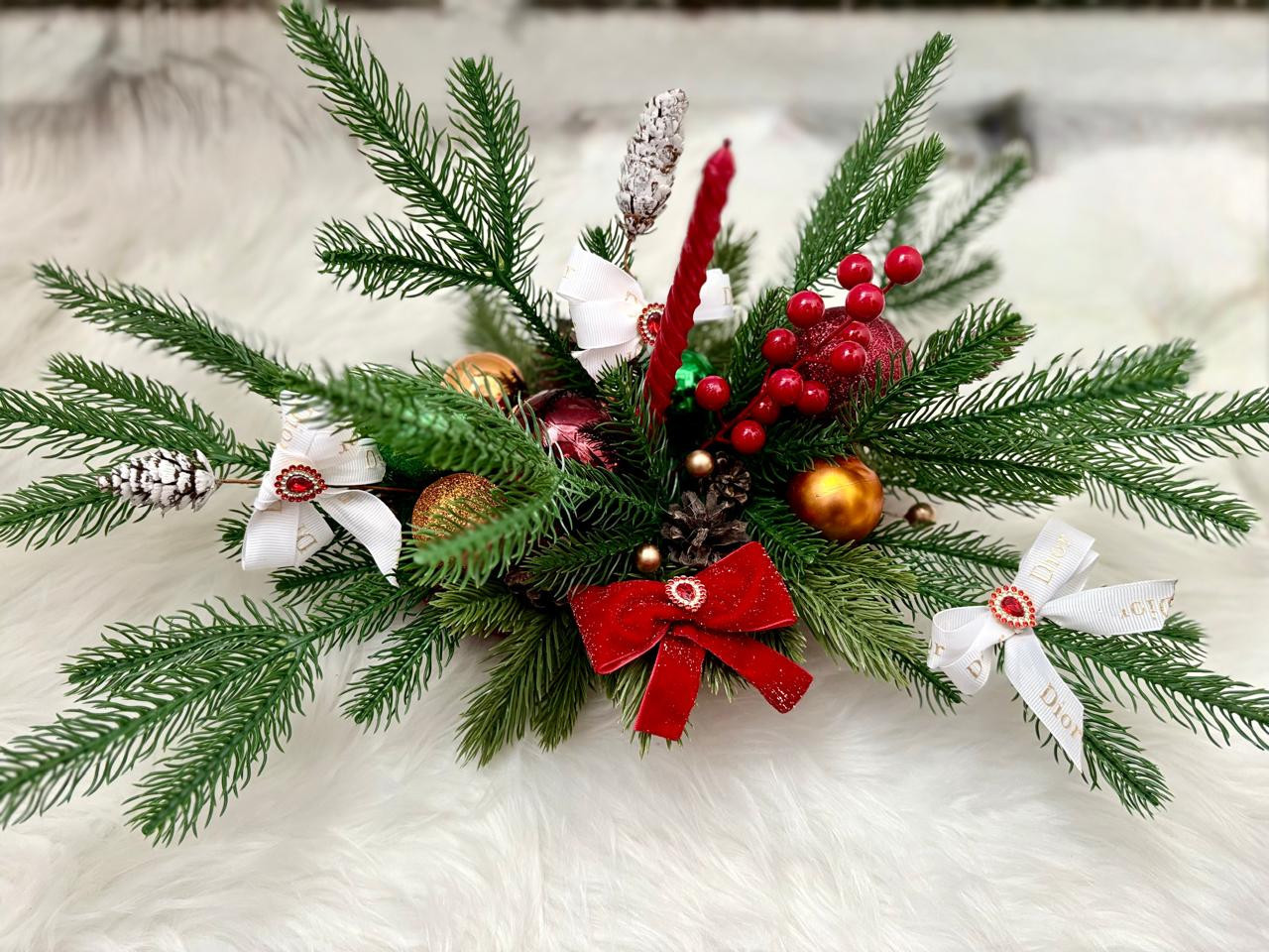 • материалы: искусственная хвоя премиум, украшения (шары, ягоды, шишки), банты;