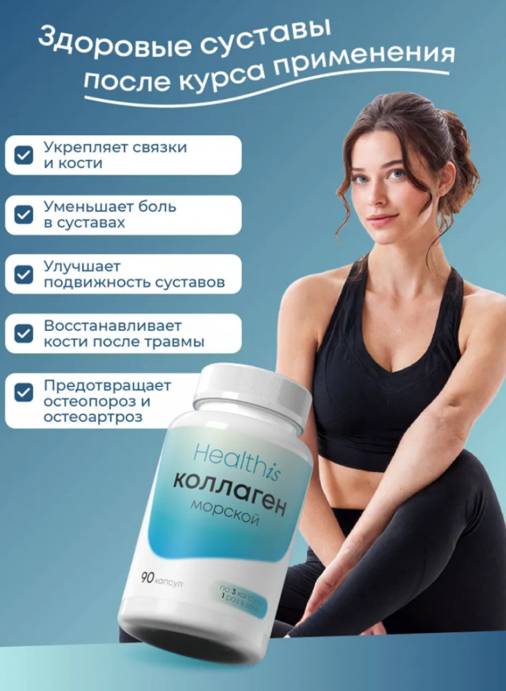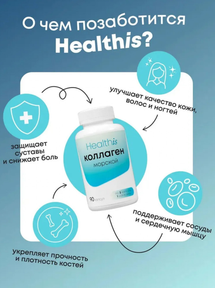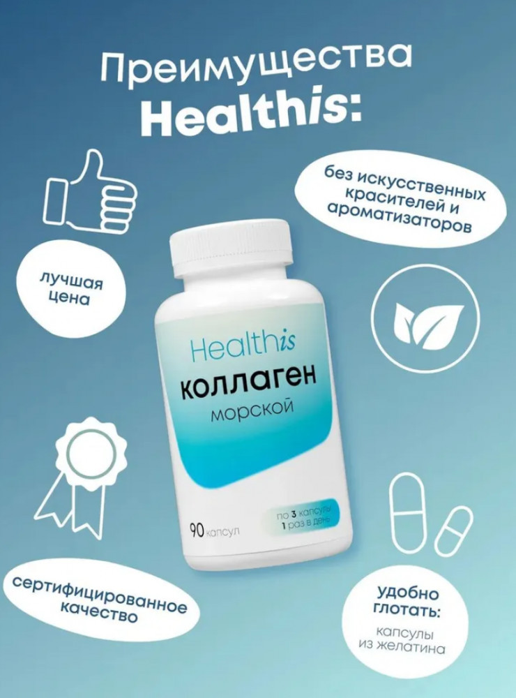 Морской коллаген в капсулах от бренда HealthIs — это незаменимая поддержка здоровья костей, суставов, а также молодости кожи, волос и ногтей. Концентрация аминокислот в морском коллагене напитывает кожу, делая ее более эластичной. Более того, он укрепляет структуру волос и ногтей, препятствуя их ломкости. |
