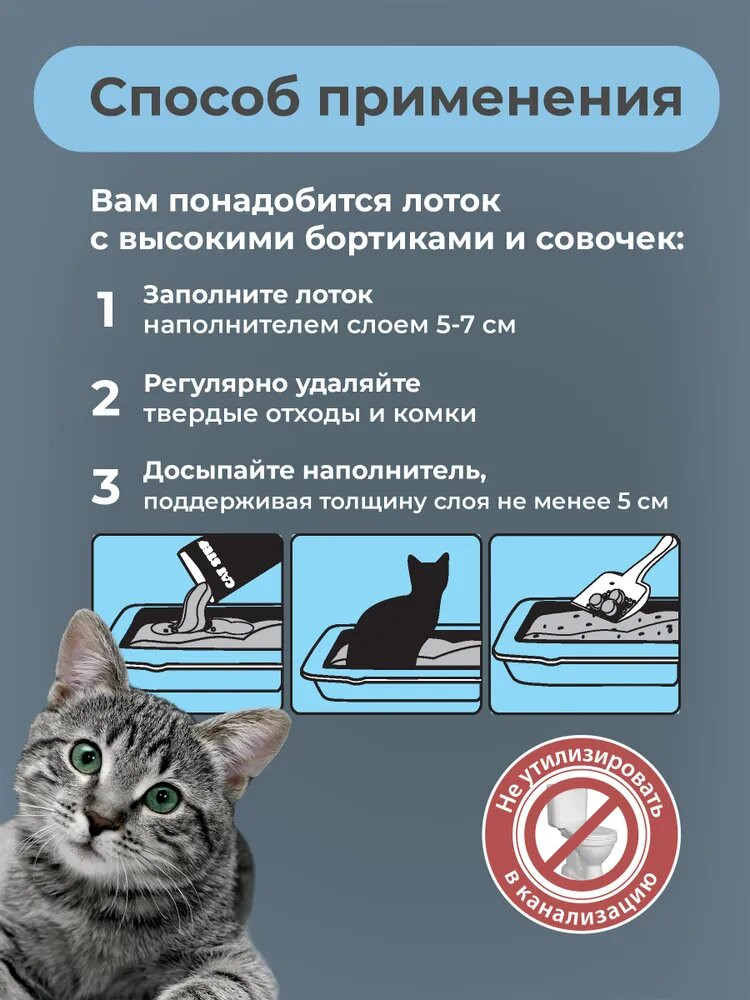 Способ применения: наполните сухой и чистый лоток наполнителем слоем 5-7 см. Регулярно удаляйте твёрдые отходы и комочки, при необходимости досыпайте свежего наполнителя. Рекомендуем использовать лоток с высокими бортами без сетки. Не утилизировать в канализацию.