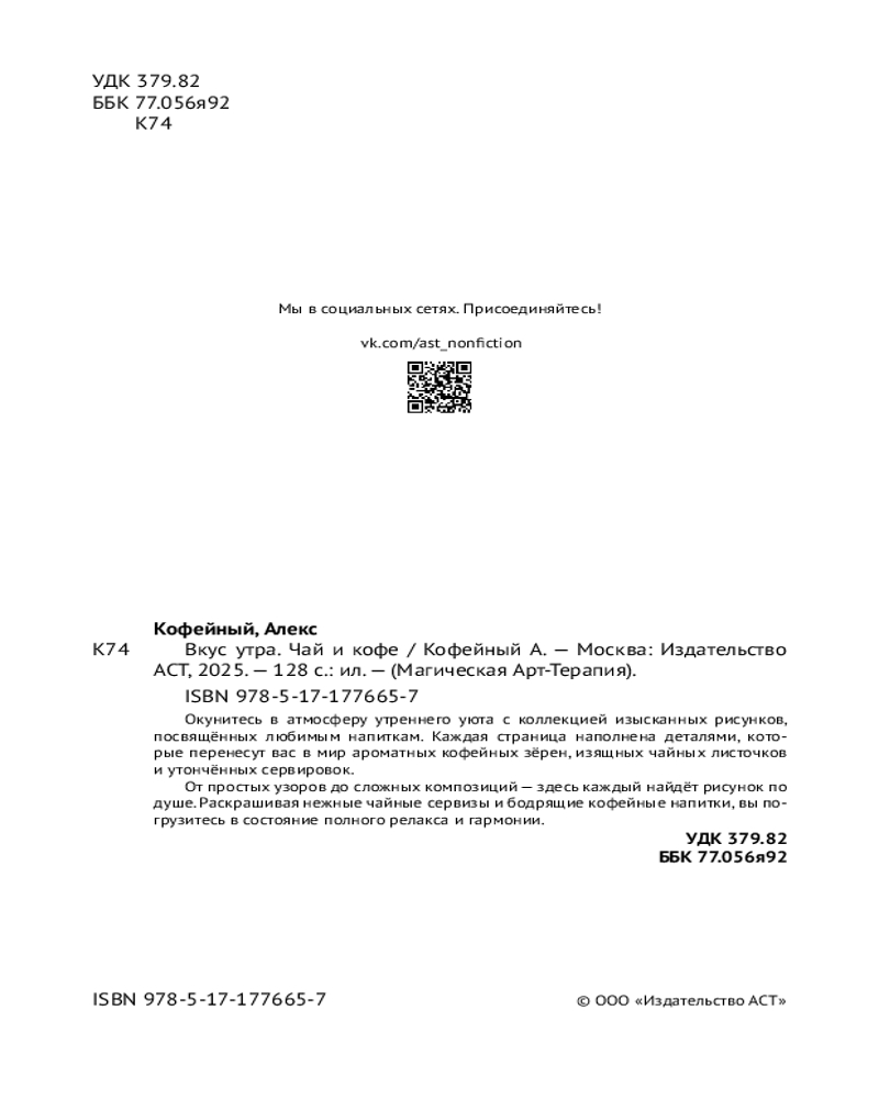 Серия: Магическая Арт-Терапия Окунитесь в атмосферу утреннего уюта с коллекцией изысканных рисунков, посвящённых любимым напиткам. Каждая страница наполнена деталями, которые перенесут вас в мир ароматных кофейных зёрен, изящных чайных листочков и утончённых сервировок. |
