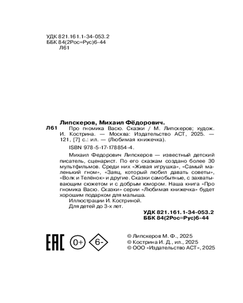 Серия: Любимая книжечка Михаил Федорович Липскеров — известный детский писатель, сценарист. По его сказкам создано более 30 мультфильмов. Среди них «Живая игрушка», «Самый маленький гном», «Заяц, который любил давать советы», «Волк и Телёнок» и другие. Сказки самобытные, с захватывающим сюжетом и с добрым юмором. Наша книга «Про гномика Васю. Сказки» серии «Любимая книжечка» будет хорошим подарком для малыша. |