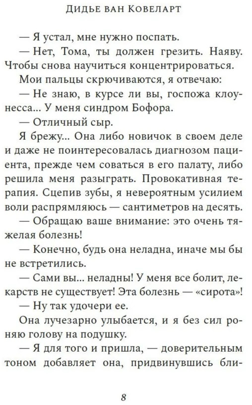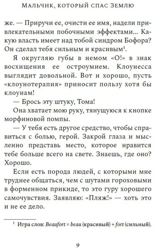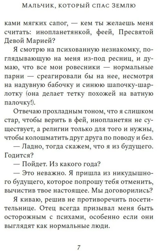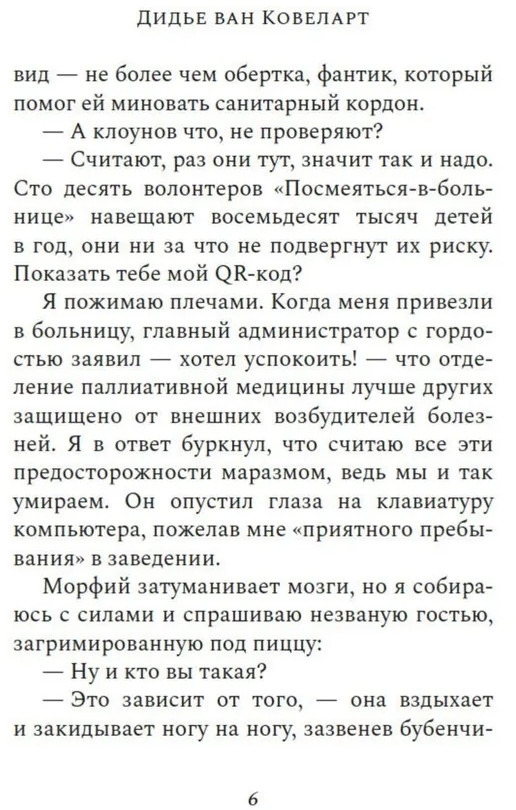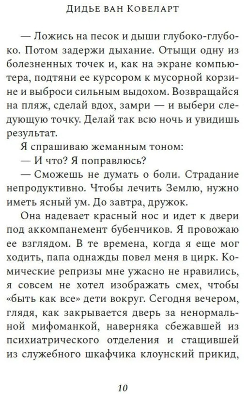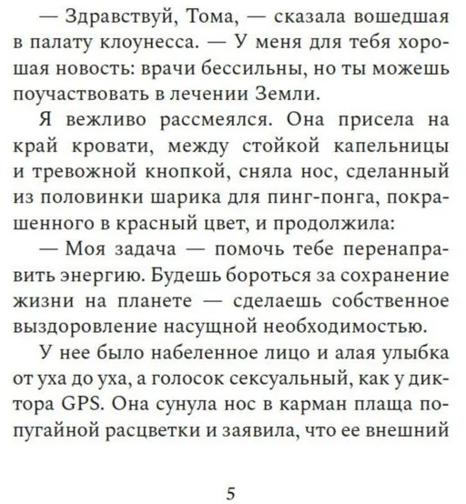 Серия: Имена. Зарубежная проза Тома всего лишь собирался умирать от неизлечимой редкой болезни, когда в его палату вдруг заявилась женщина в костюме клоунессы и заявила: «Тома, спасение мира в твоих руках». Звучало достаточно бредово, поэтому Тома ей, конечно же, не поверил. Но а что если есть хоть крошечный шанс, что это и в самом деле правда? Что если хотя бы попробовать прислушаться к сумасшедшей, ведь что ему, в конце концов, осталось терять? А вдруг судьба Земли и всех ее обитателей и впрямь зависит именно от него? |