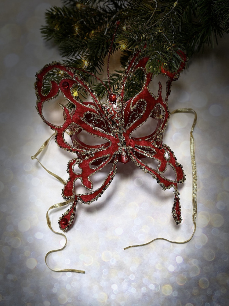 Christmas DeLuxe Маска-бабочкановинка В данный момент этот товар отсутствует в продаже. Возможно, у нас найдется аналогичный или похожий товар здесь. Серия: Премиум Элегантный аксессуар для особых случаев. Изящная форма бабочки подчёркивает глаза и придаёт образу загадочность, а насыщенный красный цвет и мерцающий золотой глиттер создают атмосферу праздника и роскоши. Лёгкая, удобная и эффектная — эта маска идеально подойдёт для маскарада, новогодней вечеринки или театрального бала. |