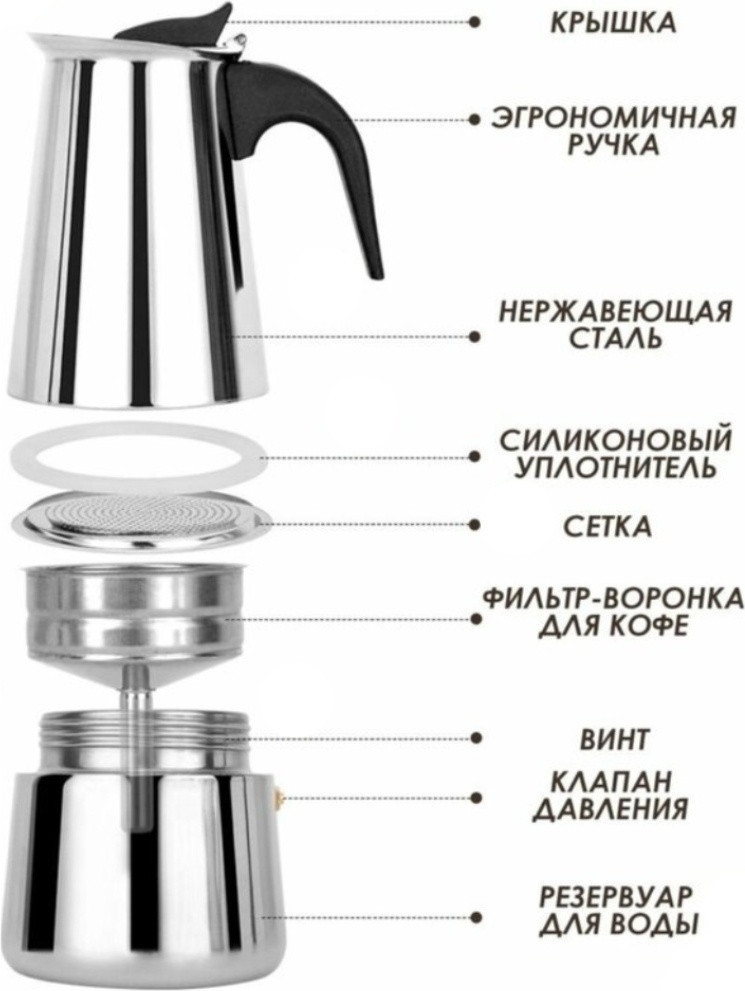 Неповторимый дизайн данной кофеварки (мокопот) прекрасно дополнит ваш гармоничный интерьер на кухне и даст насладиться ярким свежесваренным кофе дома, на работает и даже на природе. |