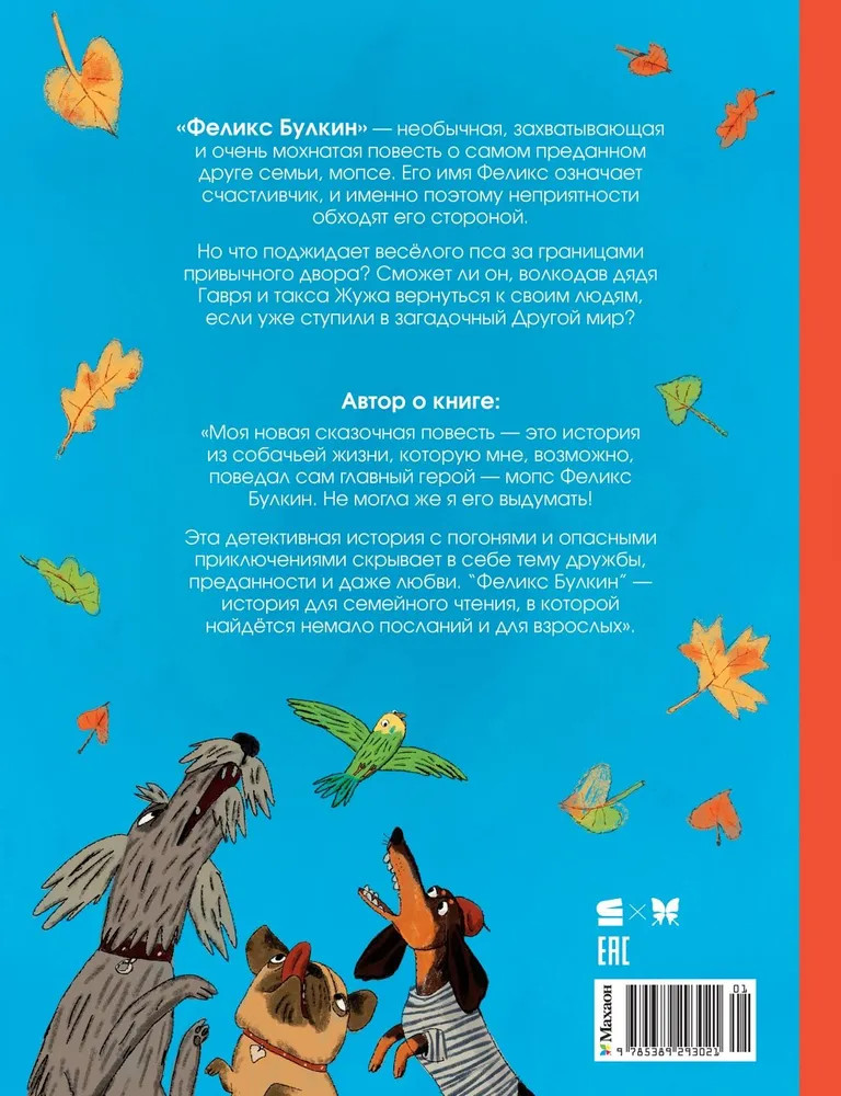 Серия: Детям. Современные российские авторы «Феликс Булкин» — необычная, захватывающая и очень мохнатая повесть о самом преданном друге семьи, мопсе. Его имя Феликс означает счастливчик, и именно поэтому неприятности обходят его стороной. Но что поджидает весёлого пса за границами привычного двора? Сможет ли он, а также волкодав дядя Гавря и такса Жужа, вернуться к своим людям, если уже ступили в загадочный Другой мир? |