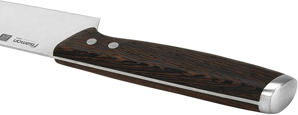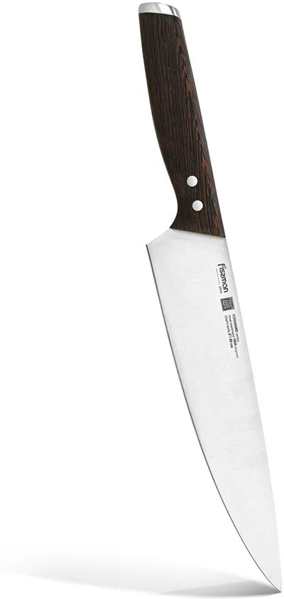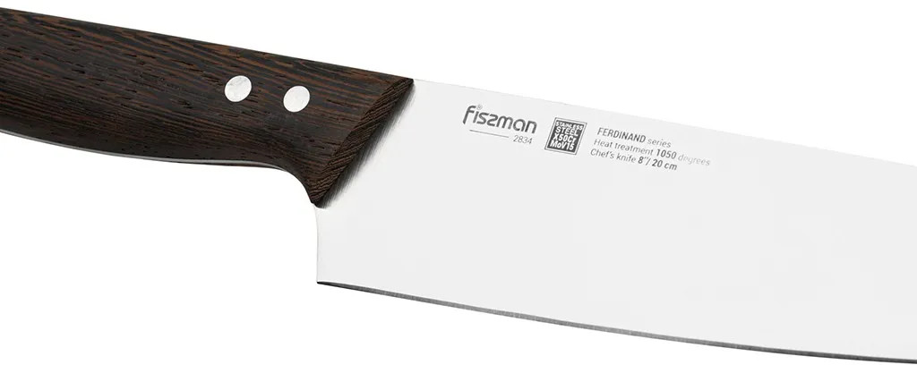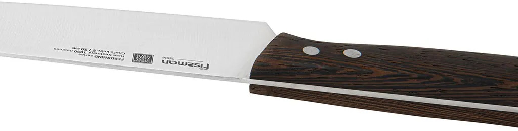 Поварской нож — незаменимый помощник на кухне. Им можно нарезать филе, нашинковать овощи, разделать мясо. Им также легко давить чеснок и другие специи, отбивать заготовки для стейков или разбивать панцирь крабов. Кухонные ножи серии Ferdinand выполнены из высоколегированной немецкой стали X50Cr15MoV, закаленной до 55 единиц по шкале Роквелла. Они обладают повышенной прочностью и подходят для частого использования. Лезвия имеют двухстороннюю симметричную заточку по всей длине режущей кромки, что обеспечивает легкую нарезку и разделку. Рукоятки из натурального африканского дерева Wenge имеют элегантную форму и обеспечивают надёжный захват. Изготовленные по особой технологии они очень удобны и эргономичны. Благодаря этой конструкции ножи безупречно сбалансированы и хорошо лежат в руке. Хотите получить надежного союзника в приготовлении быстрого завтрака, сытного обеда, изысканного ужина? Fissman поможет в реализации любых идей!