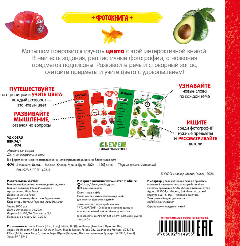 Серия: Первые знания. Фотокниги Фотокнига «Цвета» увлечет ребенка надолго и научит различать цвета на примере разных предметов. Благодаря большому формату и плотному картону она идеально подходит для занятий даже с полугодовалым малышом. Почему работать с этой книжкой так интересно? На каждом развороте малыш будет знакомиться с новым цветом, играть в «найди и покажи», отыскивая и считая заданные предметы, отвечать на вопросы. Занятия с книгой помогут расширить кругозор и увеличить словарный запас, ведь названия всех предметов подписаны, а это 261 новое слово! |