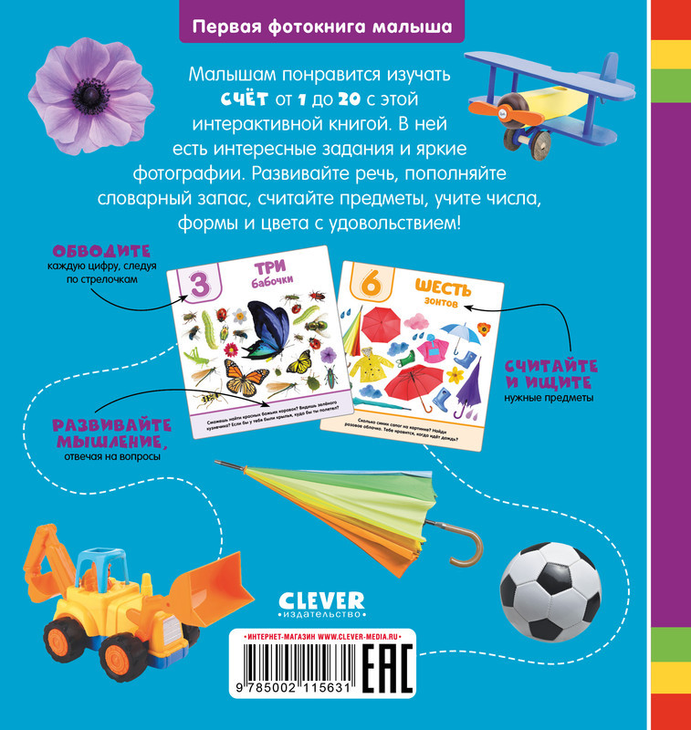 Серия: Первая фотокнига малыша Малышам понравится изучать счёт от 1 до 20 с этой интерактивной книгой. В ней есть интересные задания и яркие фотографии. Развивайте речь, пополняйте словарный запас, считайте предметы, учите числа, формы и цвета с удовольствием! |