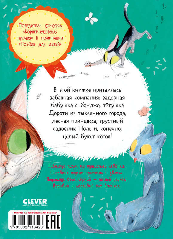 В этой книжке стихов притаилась забавная компания: задорная бабушка с банджо, тетушка из тыквенного города, лесная принцесса, грустный садовник и, конечно, целый букет котов! Гибискус похож на пушистого львенка. Шиповник мяучит протяжно и звонко. Подсолнух весь черный — печной уголёк. Игривый и ласковый кот Василёк. Сборник стихотворений также выходит в другом оформлении под названием «Полная тачка чудаков и чудачек».