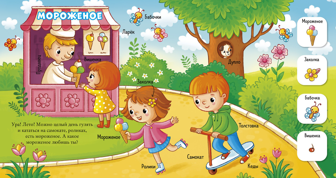 Серия: Найди и покажи, малыш Каждое время года по-своему чудесно! Весной природа оживает и дети пускают кораблики в ручейках. Летом тепло и светит солнышко — можно целыми днями кататься на самокате и есть мороженое! Осенью приятно гулять в парке и любоваться золотыми листьями. А снежная зима — время кататься с горки и лепить снеговиков! Рассматривайте пейзажи и сюжеты на страницах книги, играйте в «найди и покажи» и изучайте времена года вместе с вашим малышом!