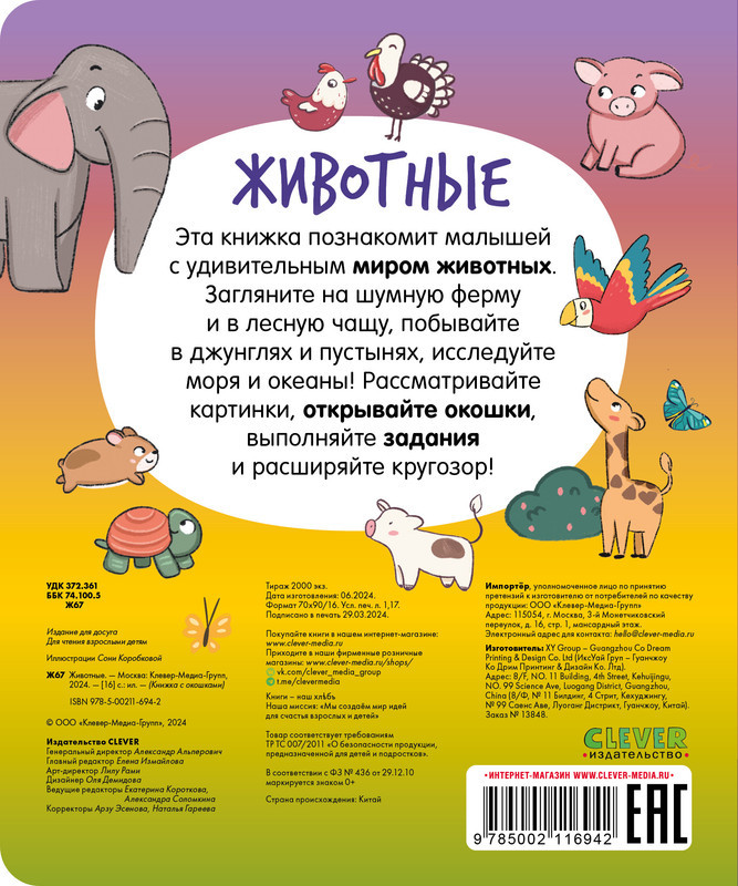 Серия: Книжка с окошками «Животные» — познавательная книга с окошками для первого знакомства малышей с дикими и домашними животными. Маленький читатель заглянет на шумную ферму и в лесную чащу, побывает в джунглях и пустынях, исследует моря и океаны. На каждом развороте ребенка ждут новые задания или вопросы про животных и окошки: под каждым прячется картинка-ответ, что превращает чтение книги в увлекательную игру. |