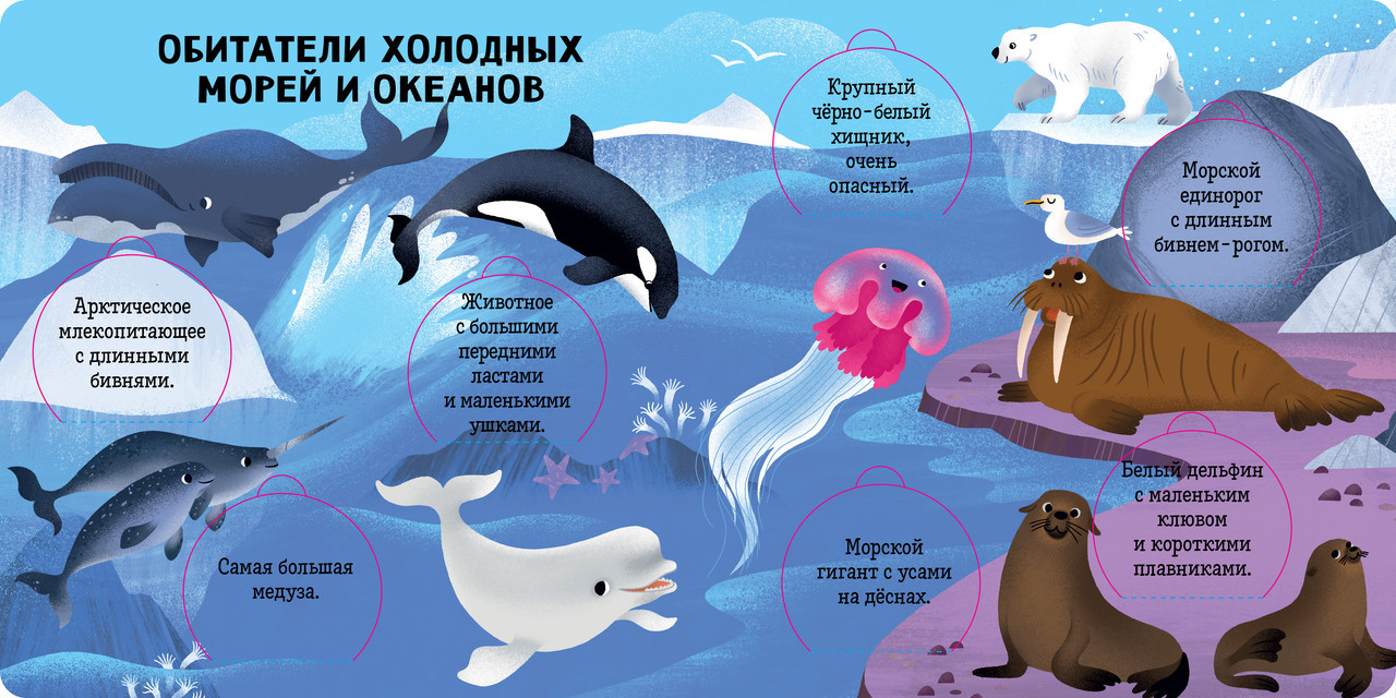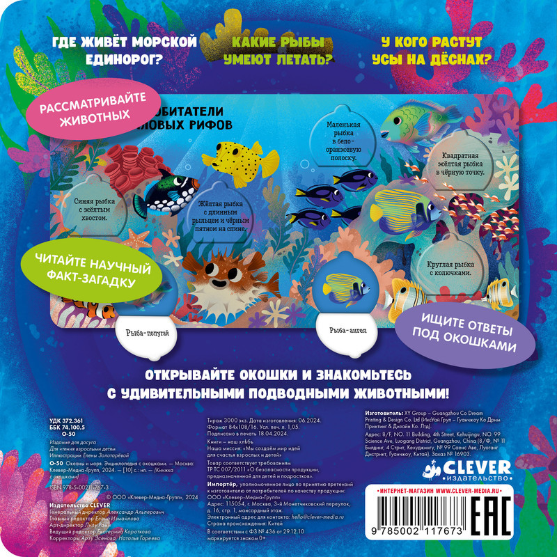 Серия: Книжка с окошками Интерактивная познавательная книга «Океаны и моря. Энциклопедия с окошками» с наглядными иллюстрациями и удобными клапанами приглашает маленьких читателей в увлекательное путешествие. На пяти тематических разворотах ребенка ждут удивительные создания, морские обитатели, яркие коралловые рифы и темные подводные глубины. Открывайте окошки и узнавайте удивительные факты про подводных животных. |
