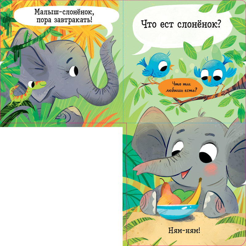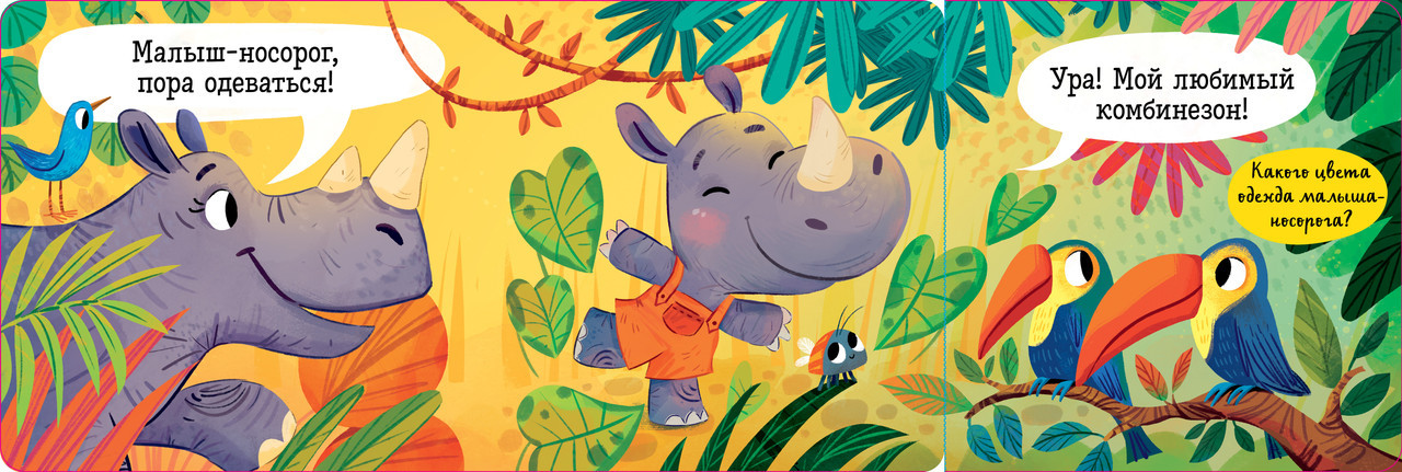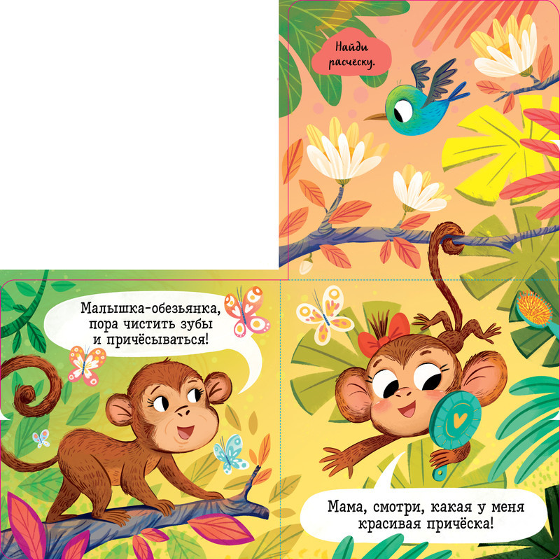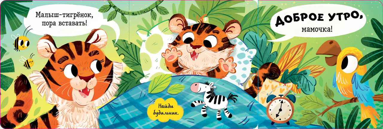 Открывайте большие картонные клапаны-окошки, ищите на картинках будильник для тигренка и расческу для обезьянки, помогите малышу полюбить утренние ритуалы!