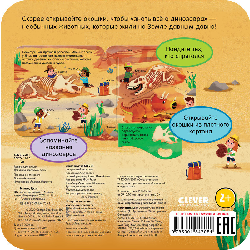 Серия: Книжка с окошками Книжки-картонки с окошками — лучший выбор для развития речи и мелкой моторики у малышей. Интерактивная книжка с 12 прочными окошками «Дино» познакомит ребенка с удивительным миром динозавров — необычных животных, обитавших на Земле давным-давно. Как играть с этой книгой? Открывайте окошки из плотного картона, запоминайте названия динозавров, ищите тех, кто спрятался! Книга выполнена из прочного картона и идеально подходит для маленьких ручек. Окошки превратят занятия с малышом в веселую игру, и ребенок захочет возвращаться к этой милой познавательной книге снова и снова. |