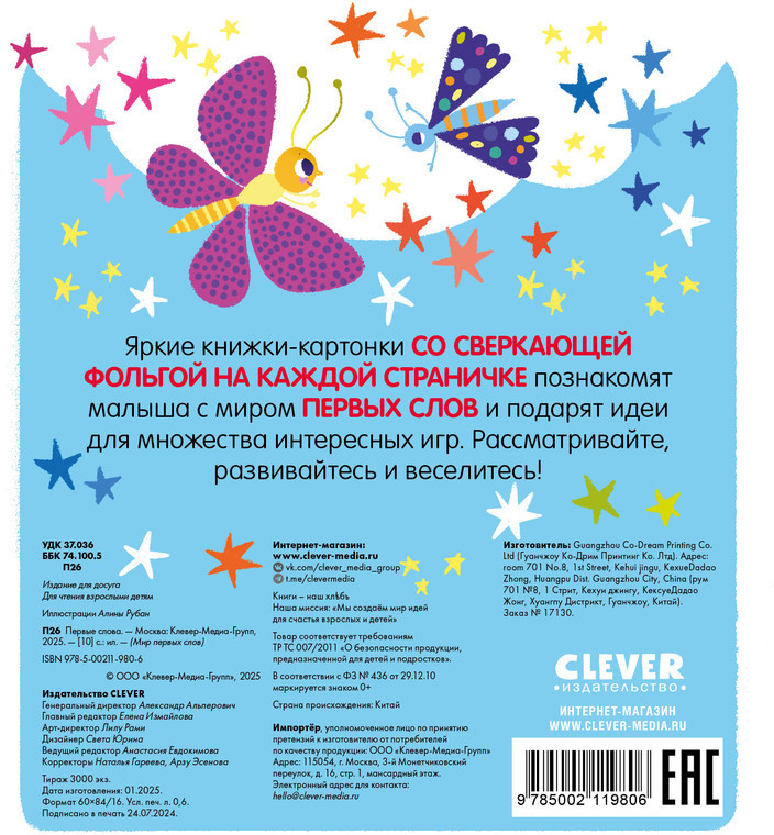 В данный момент этот товар отсутствует в продаже. Возможно, у нас найдется аналогичный или похожий товар здесь. Серия: Мир первых слов «Первые слова» — это книжка-картонка со сверкающей фольгой на каждой страничке, это развитие, веселье и множество идей для игр! Рассматривая яркие красочные иллюстрации, малыши 1, 2, 3 лет смогут развивать память, внимание. Придумывая рассказы по картинкам (например, о червячке, который живет в яблоке, или о льве, который едет на машине), ребенок будет развивать воображение и речь, а еще учить новые слова. Ведь «Первые слова» — это отличный визуальный словарь!