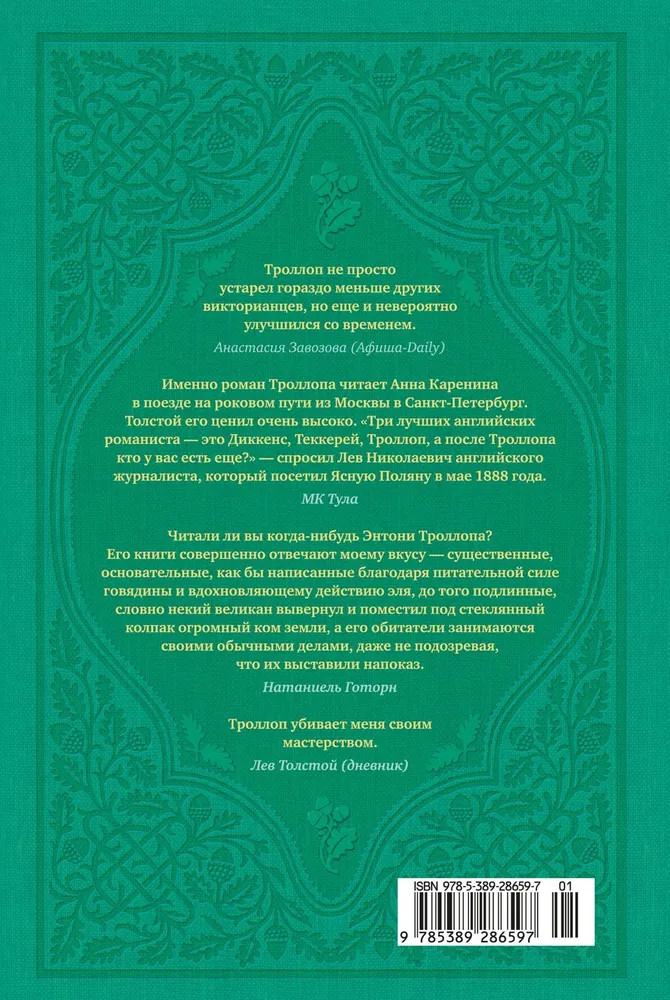 Энтони Троллоп — британский классик, современная популярность которого в англоязычном мире может сравниться разве что со славой Джейн Остин («Троллоп убивает меня своим мастерством», — писал в своем дневнике Лев Толстой), а «Барсетширские хроники» заслуженно считаются едва ли не главным его достижением. (В 1982 году на Би-би-си вышел сериал «Барчестерские хроники», где снимались Алан Рикман и Дональд Плезенс.) Данная книга включает первые две «хроники» — «Смотритель» и «Барчестерские башни», — которые часто сравнивают с «Соборянами» Лескова. В тихом провинциальном городке разыгрываются нешуточные страсти, и в барчестерских соборянах — смотрителе и архидьяконе, епископе и миссис Прауди — читатель неожиданно узнает себя, своих родных и коллег, а в церковных дрязгах викторианской Англии, в конфликте между личной совестью и традиционными привилегиями — животрепещущие проблемы современности.