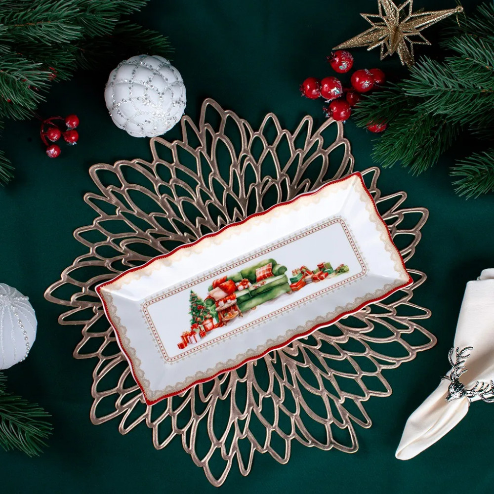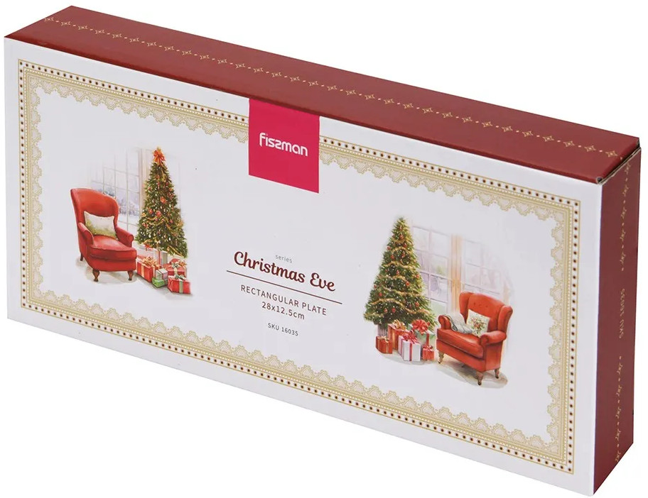 Серия: Christmas eve Представьте: на вашем столе — не просто блюдо, а целая зимняя сцена. Прямоугольное блюдо Christmas eve 28×12,5 см из премиального фарфора — это сюжет из эксклюзивной новогодней коллекции, на котором запечатлён самый тёплый момент праздника: нарядная ёлка, мягкий диван и новогодниеподарки.