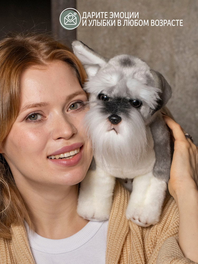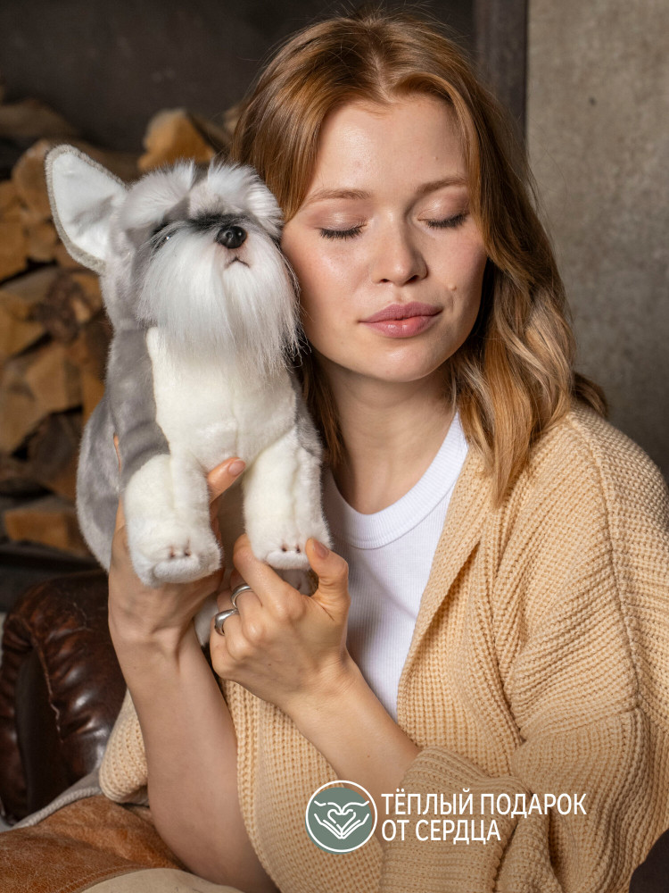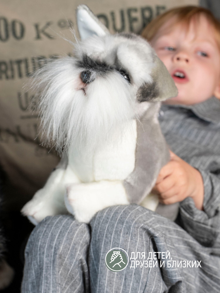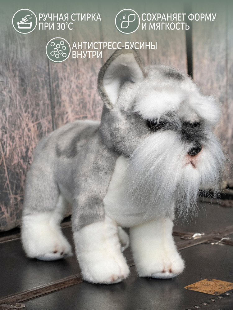 Серия: Real animals Мягкая игрушка собака реалистичная Шнауцер 27 см из коллекции Real Animals — это удивительная плюшевая собачка, выполненная с невероятной детализацией. Эта игрушечная собака выглядит как живая. Щенок стоит на лапках, словно настоящий пёс. Мягкая игрушка выполнена из высококачественного искусственного меха, который приятен на ощупь и гипоаллергенен. Это настоящий пушистый питомец, который подарит тепло и радость. Шнауцер — порода с характерной бородой и бровями, что придаёт ей выразительный и немного суровый вид. У плюшевого пса крепкое тело и прямая спина. Морда у щенка короткая и широкая, а стоячие треугольные уши добавляют особый шарм. Глаза у пса небольшие, черные и очень выразительные. Они придают шнауцеру умное и живое выражение лица. Шерсть густая, короткая и очень мягкая. Окрас — классический серый, а хвост короткий и аккуратный. Он станет пушистым другом, который всегда рядом. Игрушечная собака с пластиковыми бусинами внутри — настоящий антистресс и уютный питомец. Шнауцер — это лучший друг для ребенка и взрослого. Этот пушистый щенок станет любимым питомцем. Такой милый пес достойный компаньон для каждого дома. |