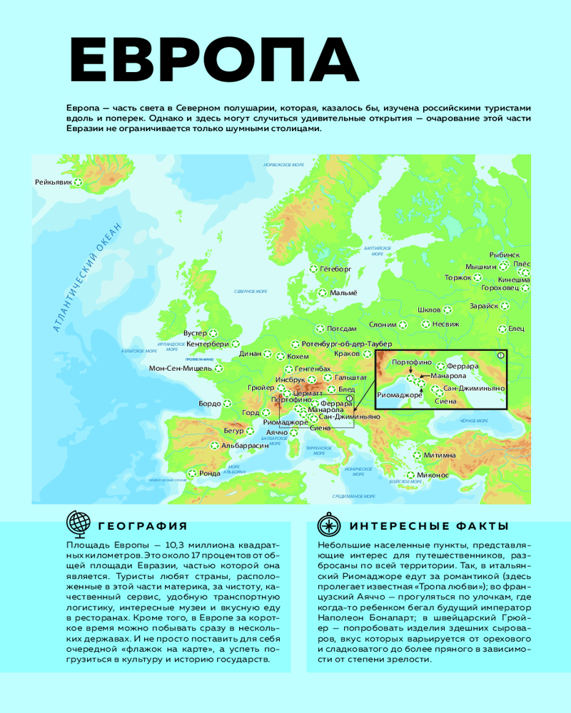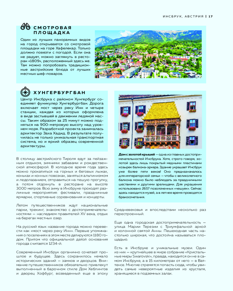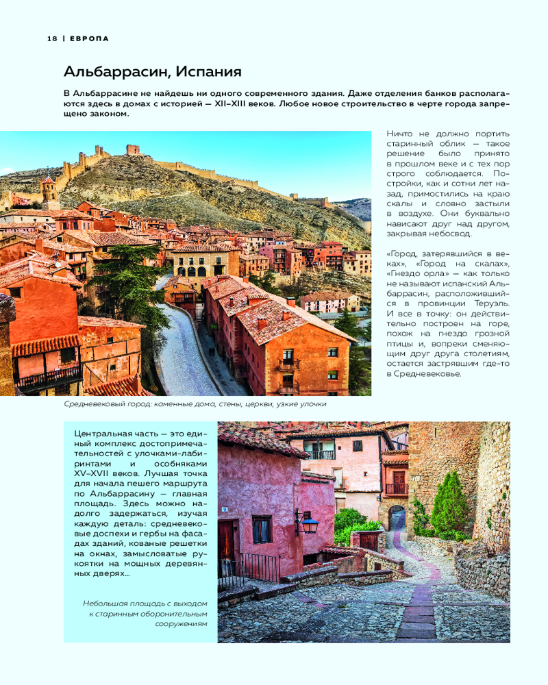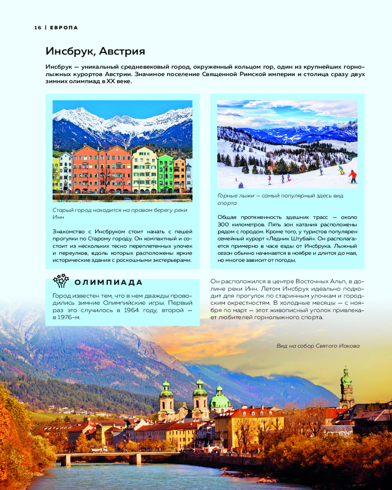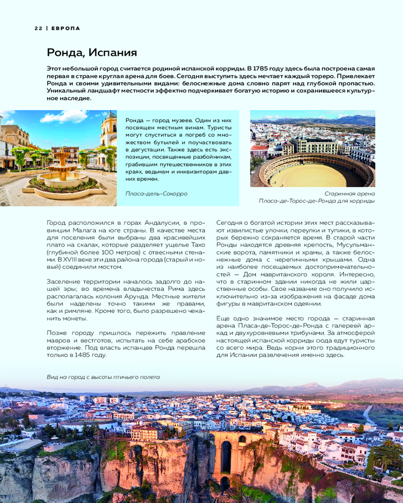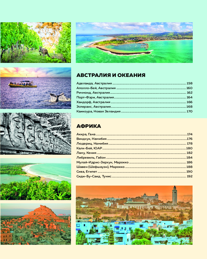 Открыв эту книгу, вы прогуляетесь по висящему над ущельем мосту в Ронде, растворитесь в медовом свете заката Сиены, найдете тихие дворики Кракова, искупаетесь в горячих источниках Баньоса, откроете белоснежный покой гор Инсбрука и Церматта, а также увидите китов в Ситке и знаковые места империи инков в Куско. |