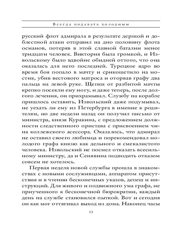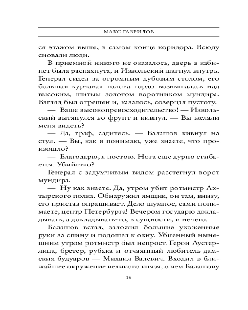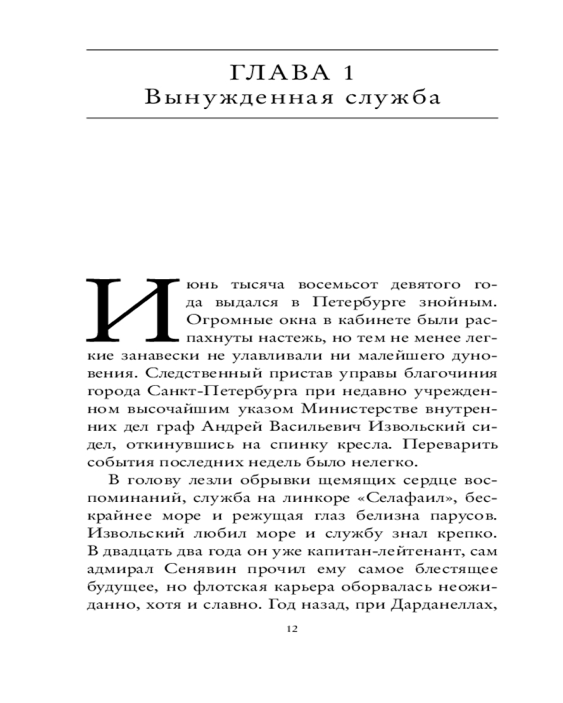Петербург июня 1809 года — город чиновных интриг, балов и знойных набережных. Россия зализывает раны после войн, а столица империи живет своей неспокойной жизнью. Молодой граф Андрей Извольский, недавний герой морских сражений, вынужден оставить флот по ранению и поступает на службу в Управу благочиния. Первое же поручение — расследование загадочного убийства гусара Михаила Валевича. Никаких следов ограбления, никакого оружия, только странное слово «ружье», произнесенное перед смертью. Сыщик постепенно восстанавливает цепь событий и узнает, что Валевич и еще семь человек некогда отбывали срок в Петропавловской крепости, а потом были освобождены. И вот по прошествии нескольких лет этих семерых кто-то начинает по порядку убивать. Граф Извольский выясняет, что убийства связаны с давними событиями, о которых предпочли бы забыть даже сами участники, ведь следы их ведут к самым верхам власти — императорской семье. |