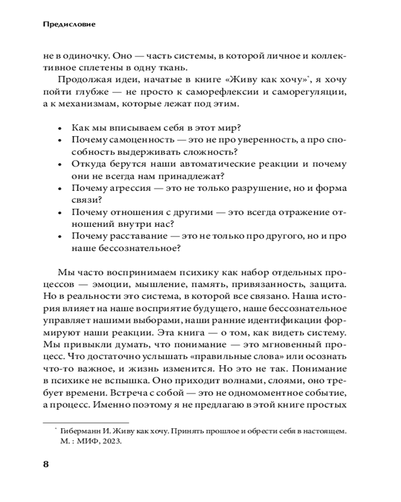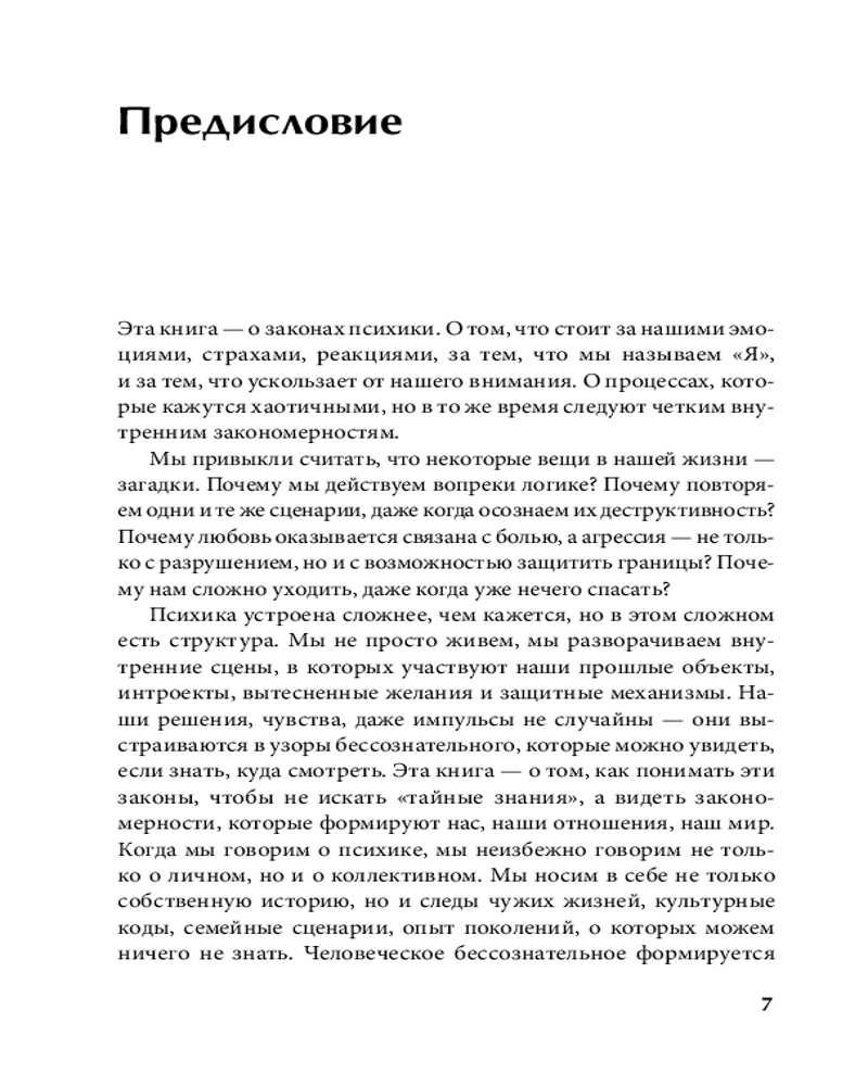 Серия: Между нами терапия Мы часто воспринимаем психику как набор отдельных процессов — эмоции, мышление, память, привязанность, защита. Но в реальности это система, в которой все связано. Наша история влияет на наше восприятие будущего, наше бессознательное управляет нашими выборами, наши ранние идентификации формируют наши реакции. Эта книга — о том, как видеть систему. Язык книги — медленный, плотный, требующий тишины. Он не объясняет, а слушает. Не лечит, а присутствует. Читатель здесь — одновременно исследователь, исследуемый и инструмент исследования. Книга сопровождает его, как аналитическая сессия: с паузами, отступлениями, с молчанием, которое говорит больше слов и создает движение. |