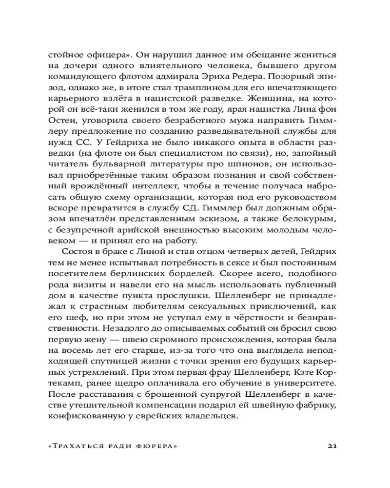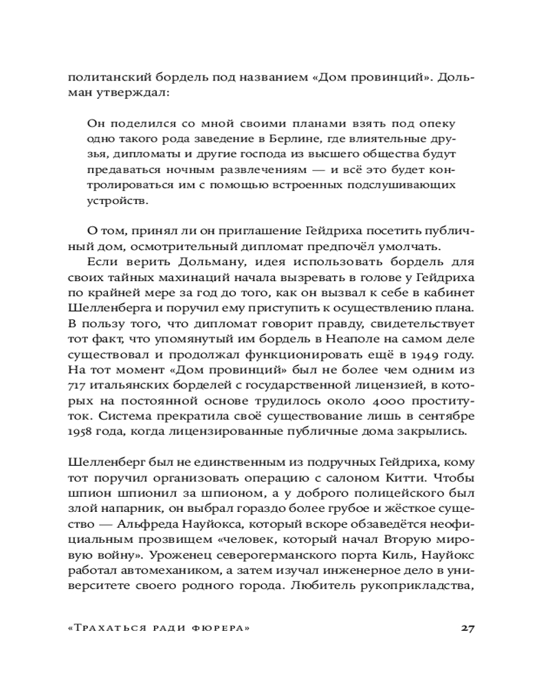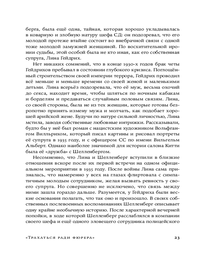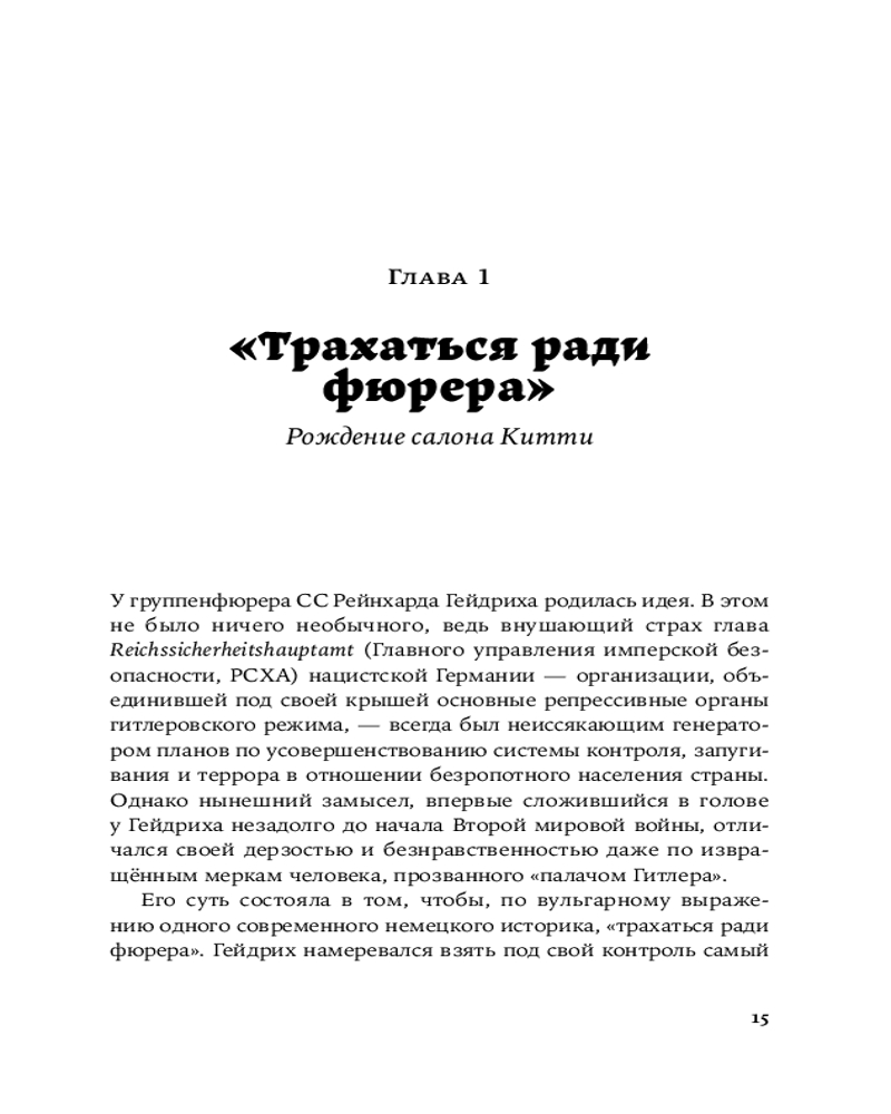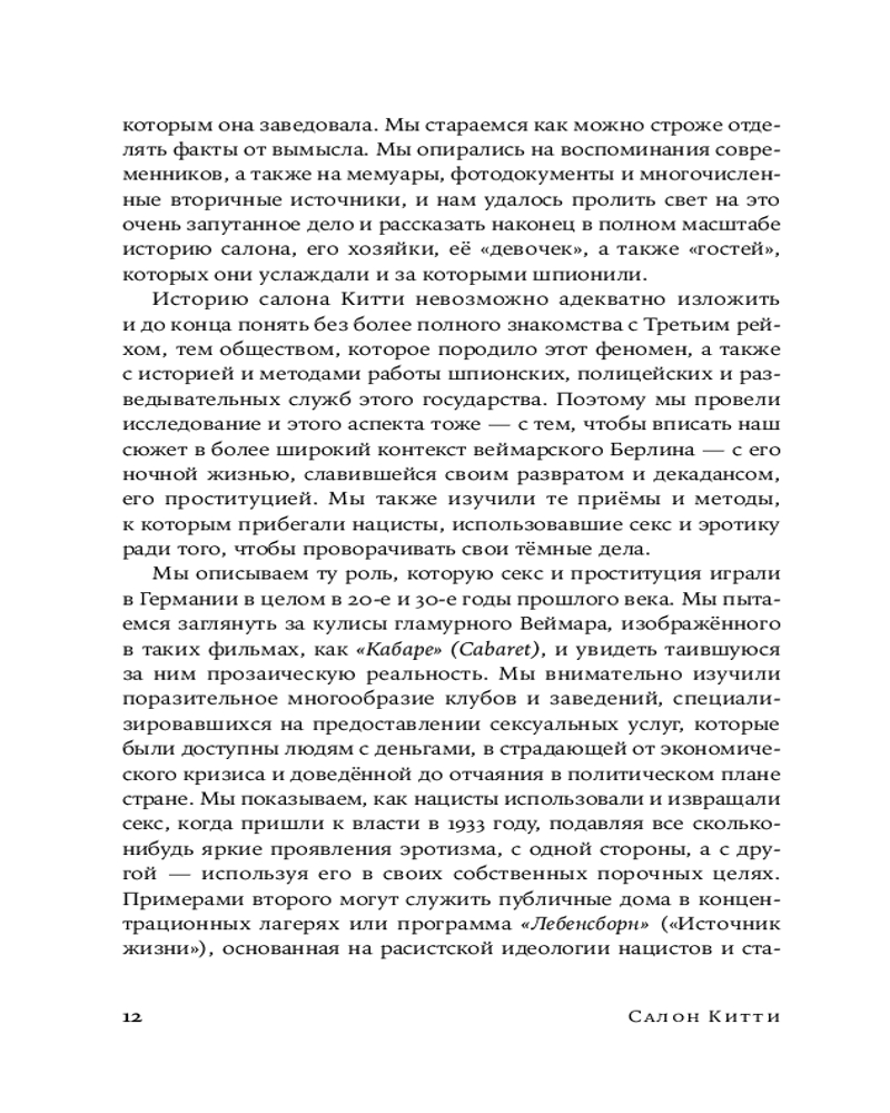 Международная команда историков на протяжении нескольких лет выясняла, что стоит за мифом о «Салоне Китти» — центре международного шпионажа, созданном нацистскими главарями на базе берлинского борделя средней руки. Кем была пресловутая Китти Шмидт — и почему ее «салон» продолжал работать и после войны? На что рассчитывали — и чего добились — Гейндрих и Шелленберг? Как островок «Веймарского Берлина» сохранился в гитлеровской Германии — и какие метаморфозы ему пришлось пережить? Как выглядела сексуальная повседневность граждан Третьего Рейха — и как одержимые вуайеризмом нацисты пытались регулировать рынок связанных с сексом услуг? |