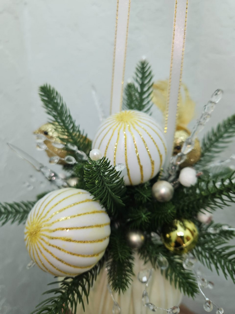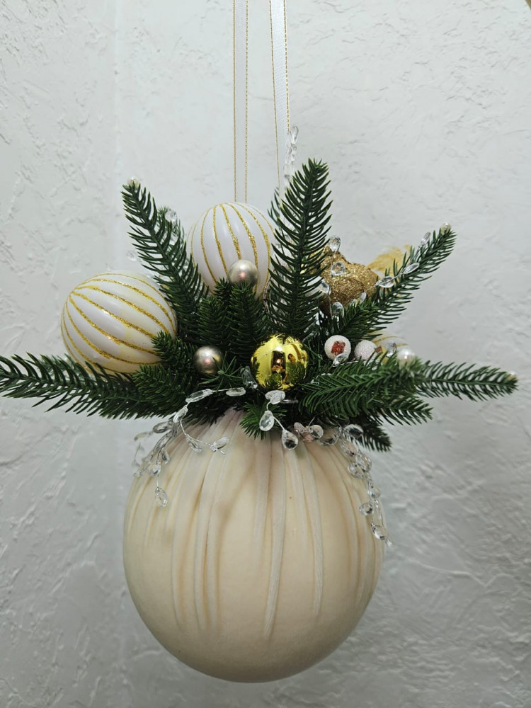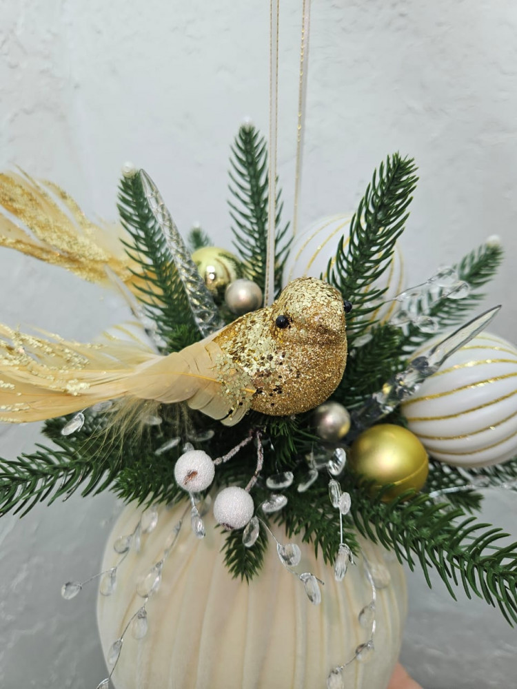 Создайте волшебную атмосферу в доме с очаровательной новогодней композицией — символом лёгкости и праздника! Элегантные шары с пушистыми еловыми ветками и яркими красными пуансеттиями станут идеальным украшением для окна, радуя глаз и снаружи, и внутри. Благодаря лёгкому пенопластовому основанию, композиция не утяжеляет крепления и абсолютно безопасна. Диаметр шара — 15 см, что делает его заметным, но не громоздким элементом декора. Бежево-кремовая основа оттеняет насыщенную зелень и алые акценты, дополненные «ледяными» бусинами и жемчужными деталями. Украшение полностью готово к размещению — просто повесьте его за красную ленту и наслаждайтесь мгновенным новогодним настроением, уютом и праздничным сиянием! |