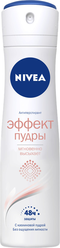 Женский спрей дезодорант-антиперспирант «Эффект пудры» от NIVEA сочетает в себе надежную защиту антиперспирирующей формулы и невероятную мягкость уникального природного компонента — каолиновой пудры. Каолин, также известный как белая глина, обладает отличными абсорбирующими и обволакивающими свойствами, поэтому сразу после нанесения дезодорант мгновенно высыхает, не оставляя липких ощущений на коже, и придает ей невероятную мягкость. Антиперспирант защищает от неприятного запаха на 48 часов. Дезодорант обладает нежным свежим цветочным ароматом на основе богатого пудрового аккорда. Без ощущения липкости на коже и без белых следов на одежде. Уже более 100 лет Nivea создает особенно бережные для кожи формулы. Испытай невероятную мягкость и эффективную защиту от пота и неприятного запаха!