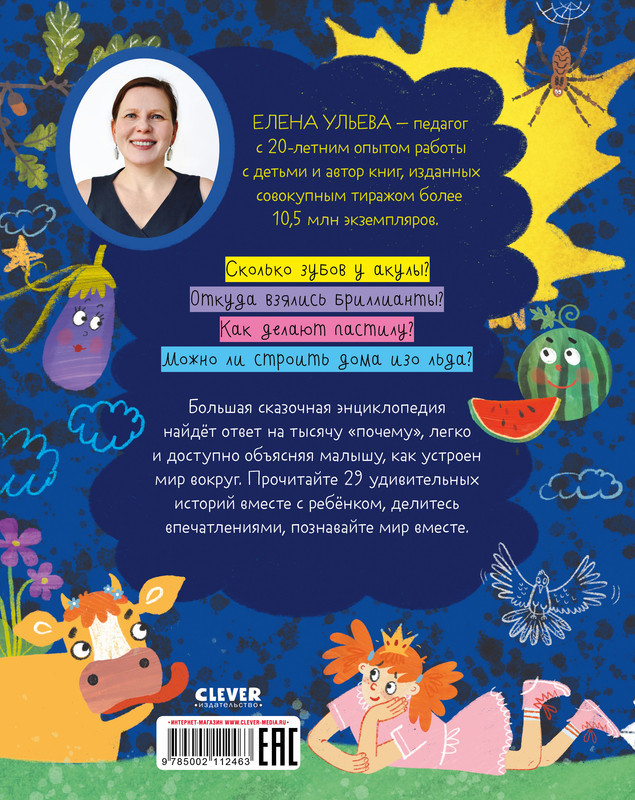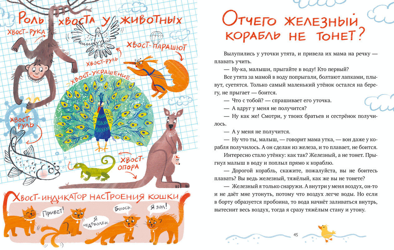 Серия: Удивительные энциклопедии Книга «Энциклопедии в сказках. Мир вокруг меня» даст детям ответ на тысячу «почему», легко и доступно объясняя, как устроен мир вокруг.Почему не тонет тяжелый железный корабль? Об этом спросил любопытный утенок, который только учился плавать. И корабль рассказал ему, что тяжелый и железный он только снаружи, а внутри у него воздух, который не дает утонуть. А еще утенок узнал, что бывают самые разные хвосты. У птицы и рыбы хвост — руль, у белки — парашют, у кенгуру хвост — опора, у обезьяны — еще одна ловкая рука, у павлина хвост — украшение, а по кошкиному хвосту можно узнать, боится она, злится или здоровается. Сколько зубов у акулы? Откуда взялись бриллианты? Как делают пастилу? Что будет, если строить дома изо льда? Эта познавательная книга понятно и увлекательно рассказывает детям о тайнах окружающего мира. |