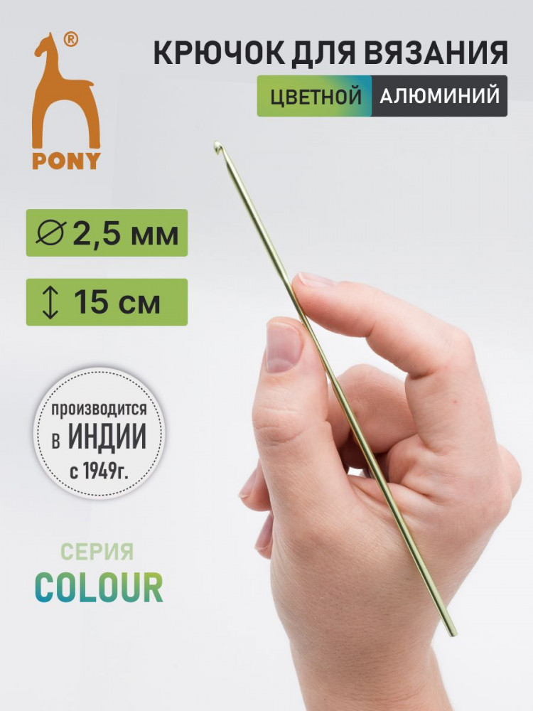 Цветной крючок для вязания Pony Colour — это яркий и удобный инструмент, идеально подходящий для создания ажурных изделий, таких как шали, платья, топы и салфетки. Вы сможете легко воплотить в жизнь любые творческие задумки: от тончайших кружевных узоров до текстурных мотивов. Крючок изготовлен из легкого и прочного алюминия со специальной обработкой. Благодаря компактным размерам и небольшому весу он легко помещается в сумке и всегда под рукой. Алюминий- гипоаллергенный материал, который подходит для людей с чувствительной кожей.